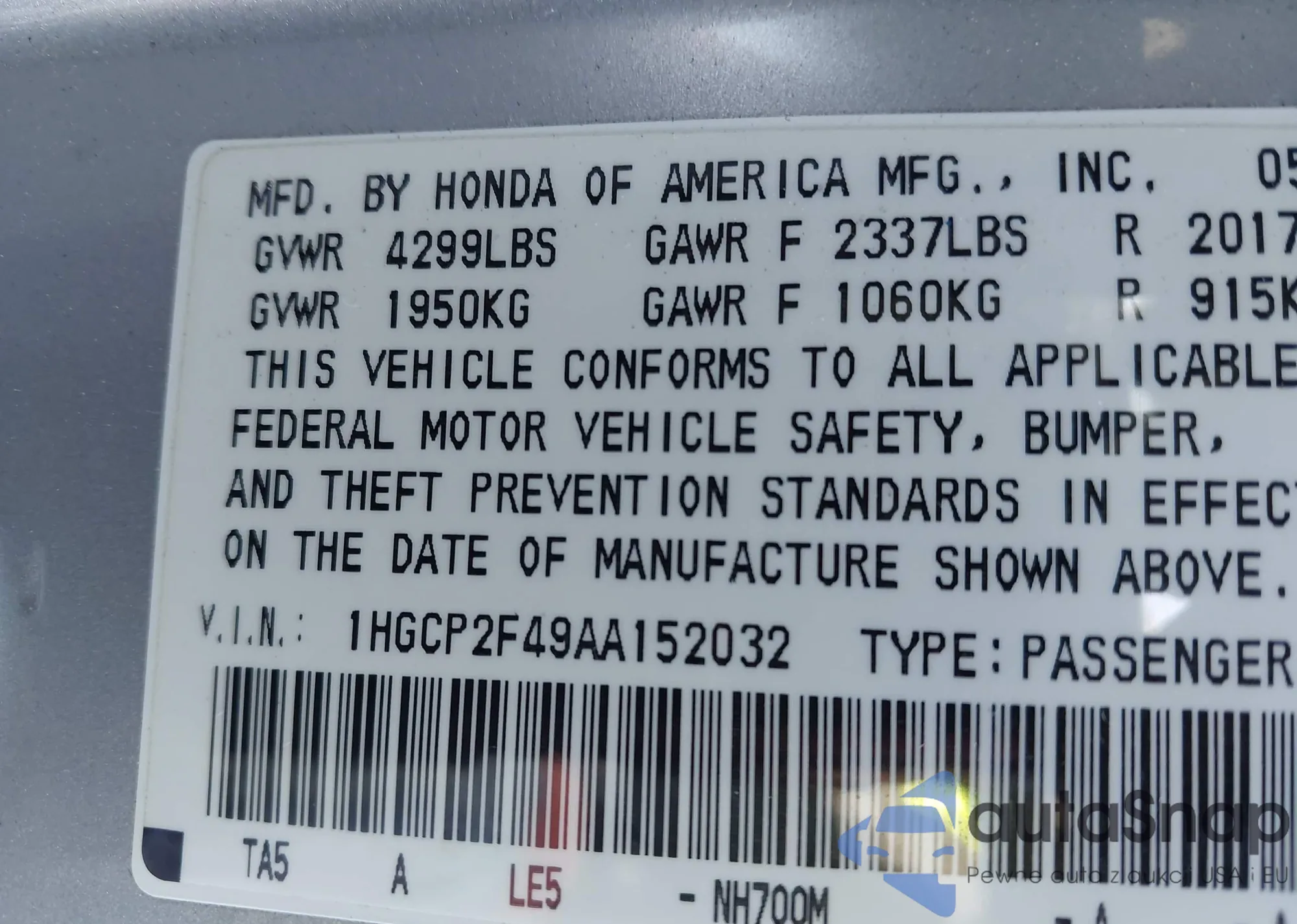 VIN: 1HGCP2F49AA152032