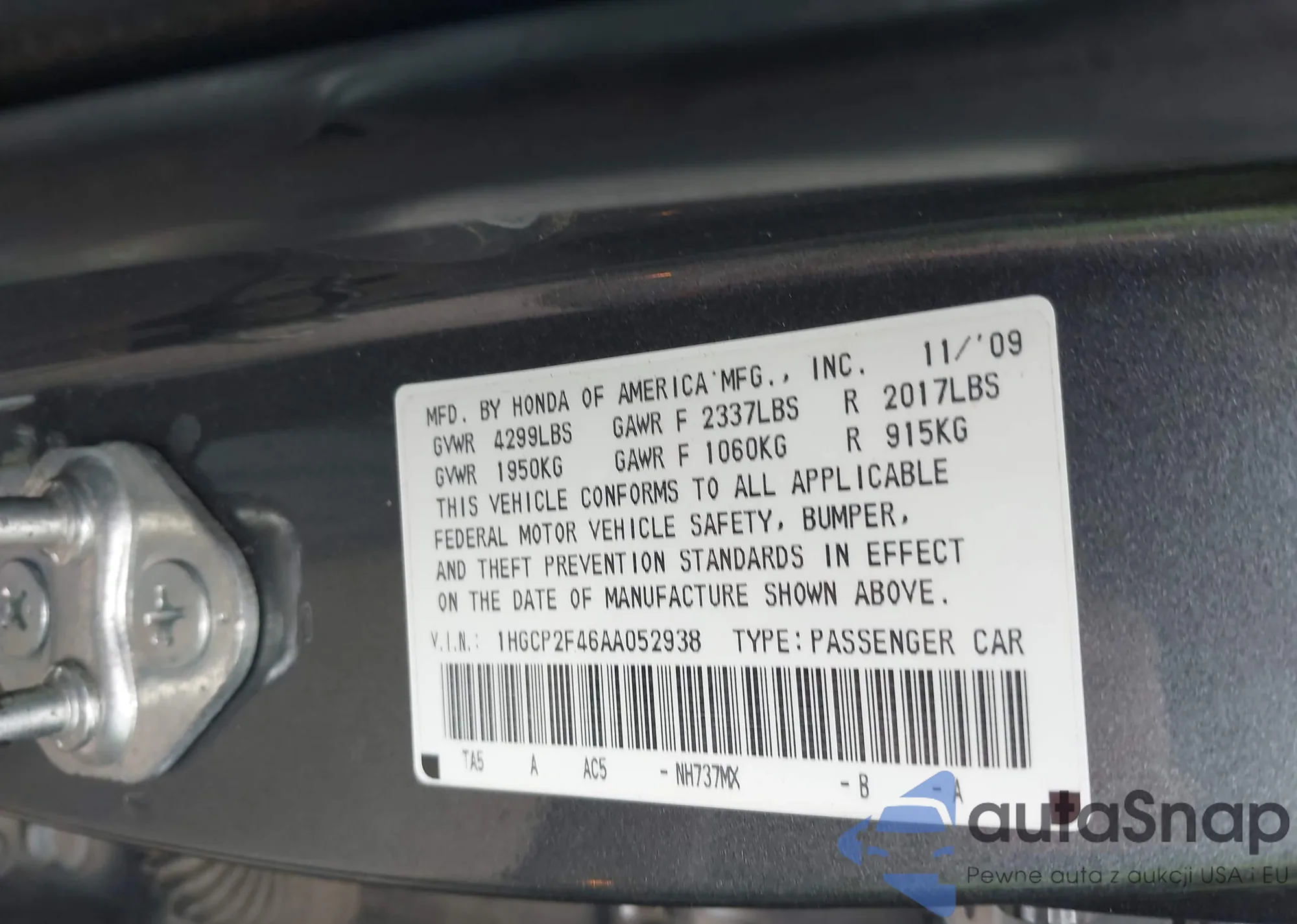 Автомобиль Honda Accord 2010 (VIN 1HGCP2F46AA052938) ранее не участвовал в торгах. Документы чистые, пробег соответствует или ниже среднего по рынку. Продаётся страховой компанией — рекомендуем покупку. Доставка в порт займет около 6–8 недель.