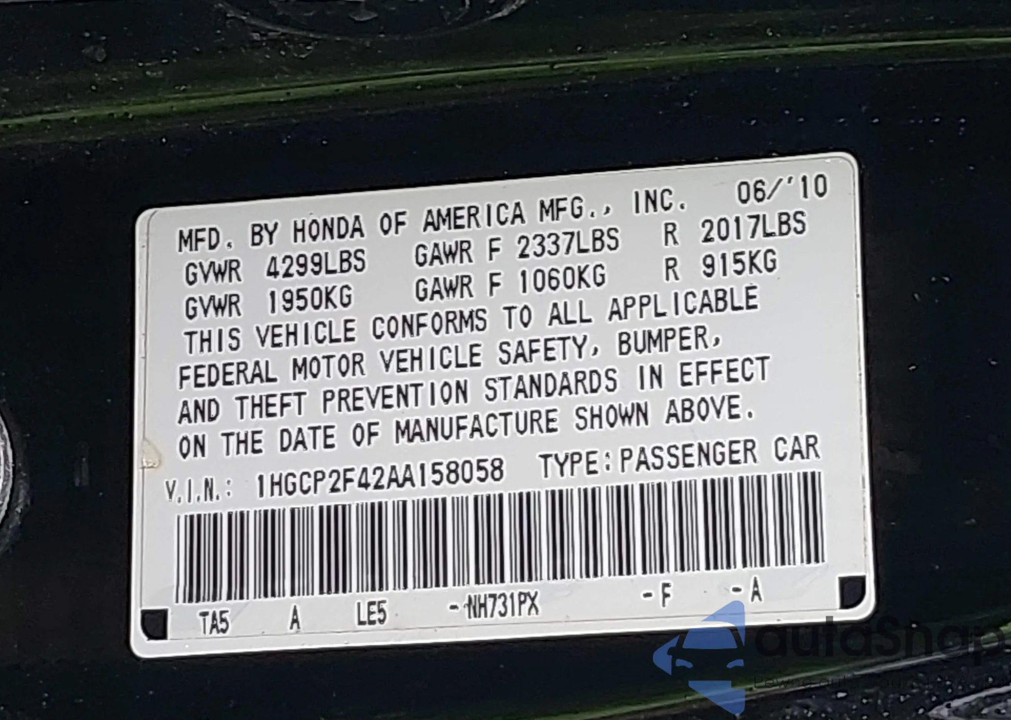 VIN: 1HGCP2F42AA158058