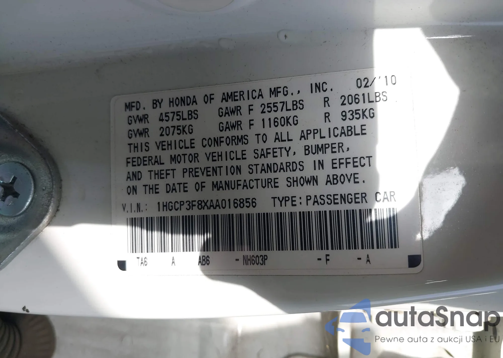 • VIN: 1HGCP3F8XAA016856