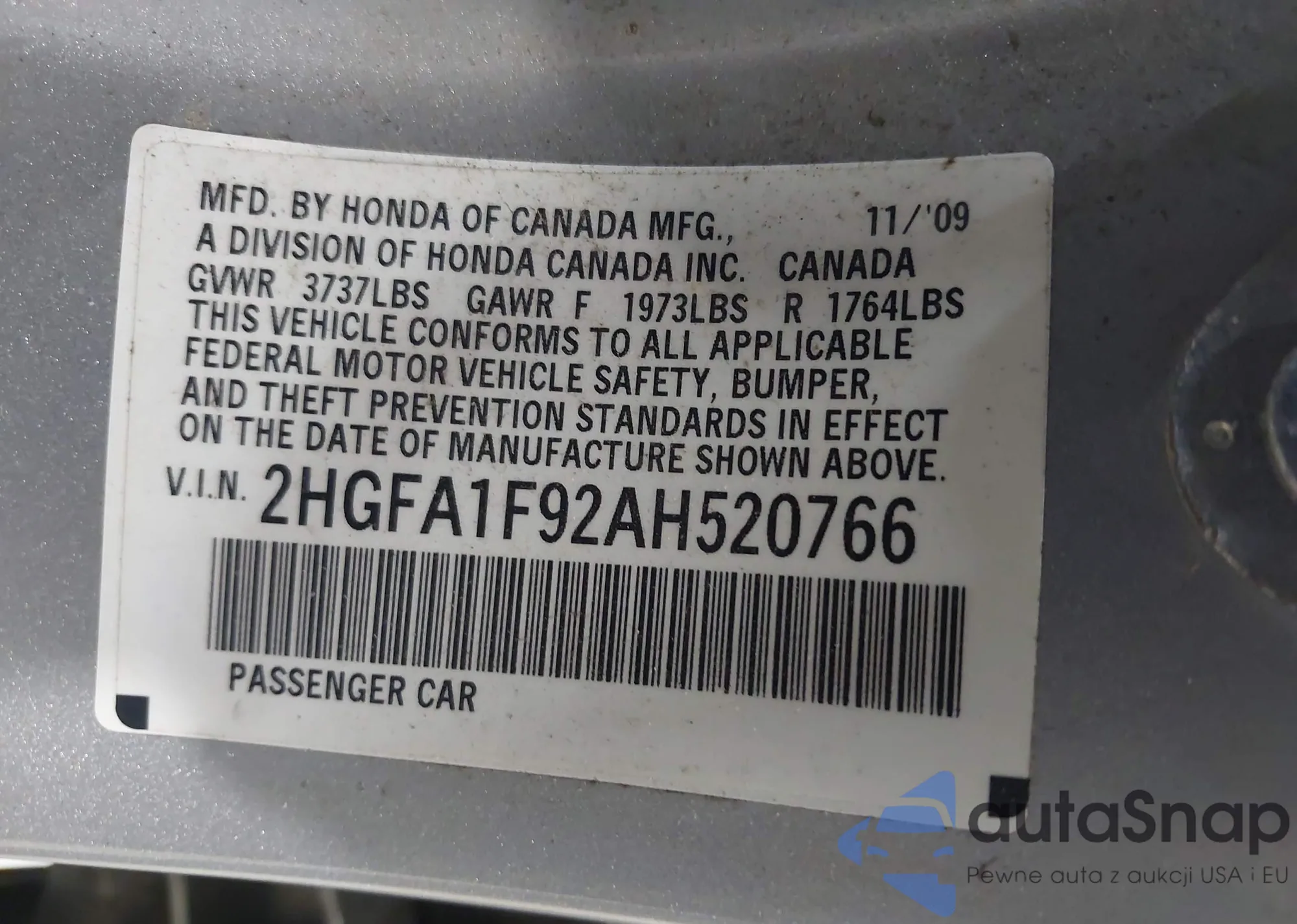 VIN: 2HGFA1F92AH520766