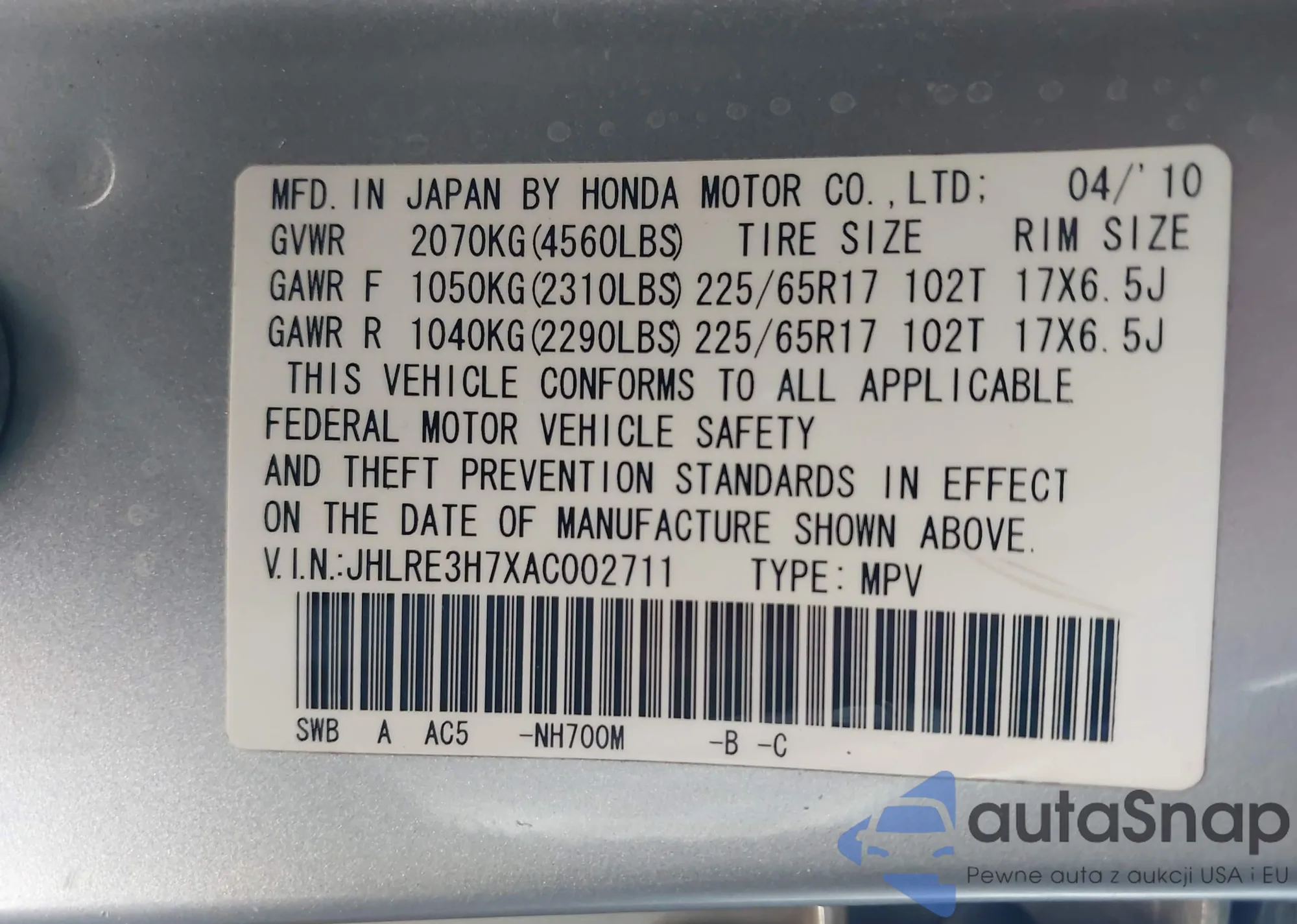Автомобиль Honda CR-V 2010 (VIN JHLRE3H7XAC002711) ранее не участвовал в торгах. Документы чистые, пробег соответствует или ниже среднего по рынку. Продаётся страховой компанией — рекомендуем покупку. Доставка в порт займет около 6–8 недель.