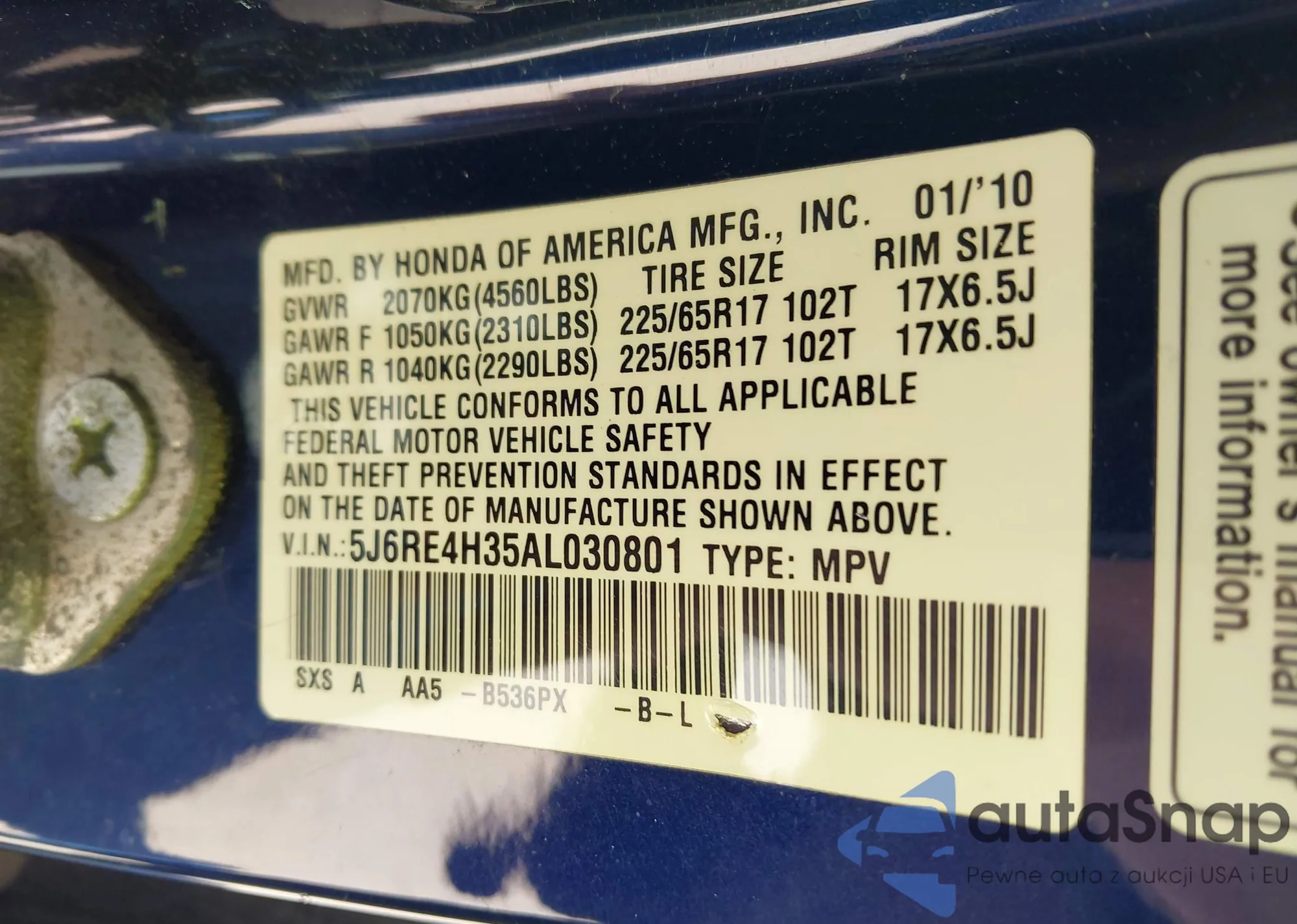 • VIN: 5J6RE4H35AL030801