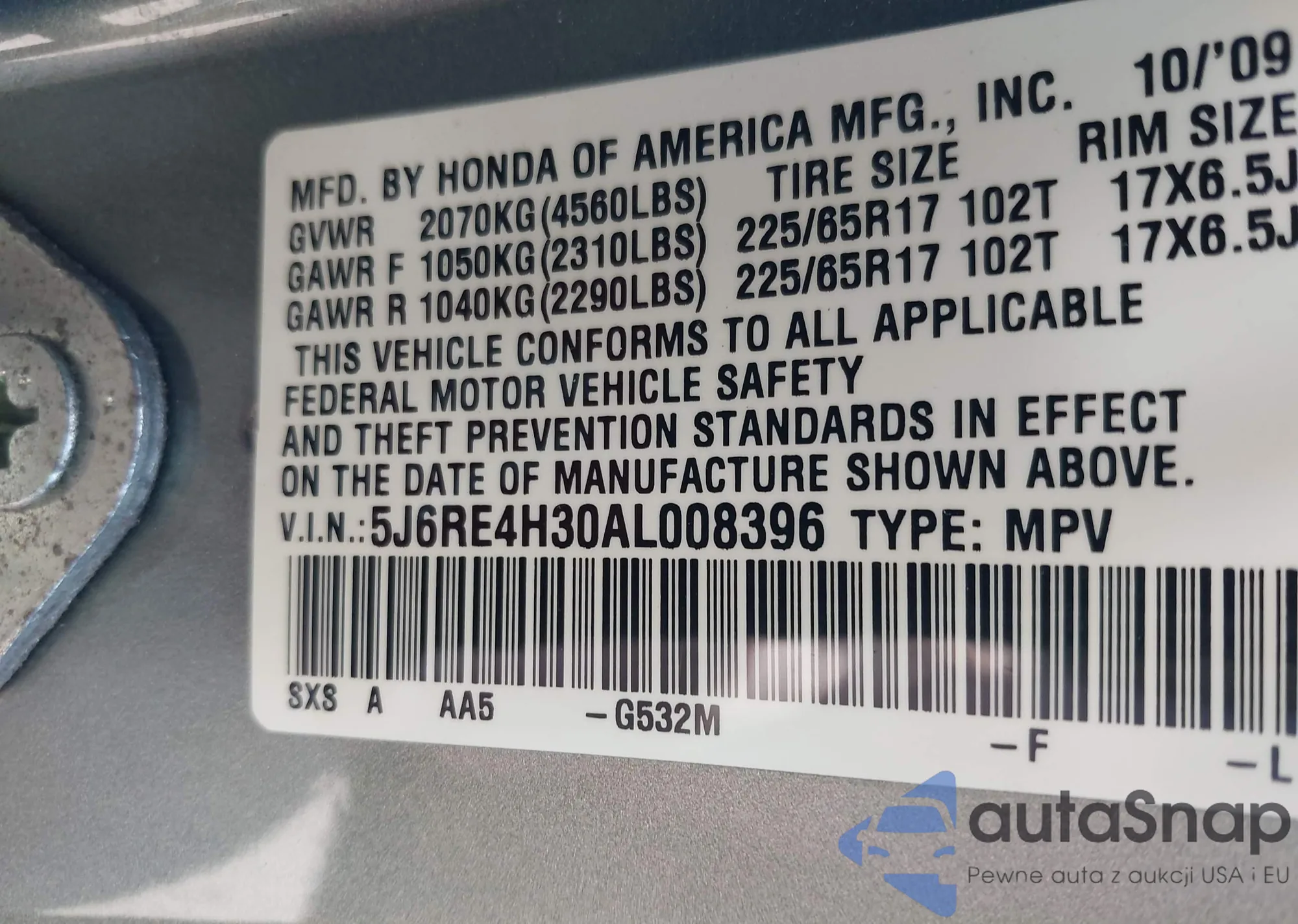 VIN: 5J6RE4H30AL008396