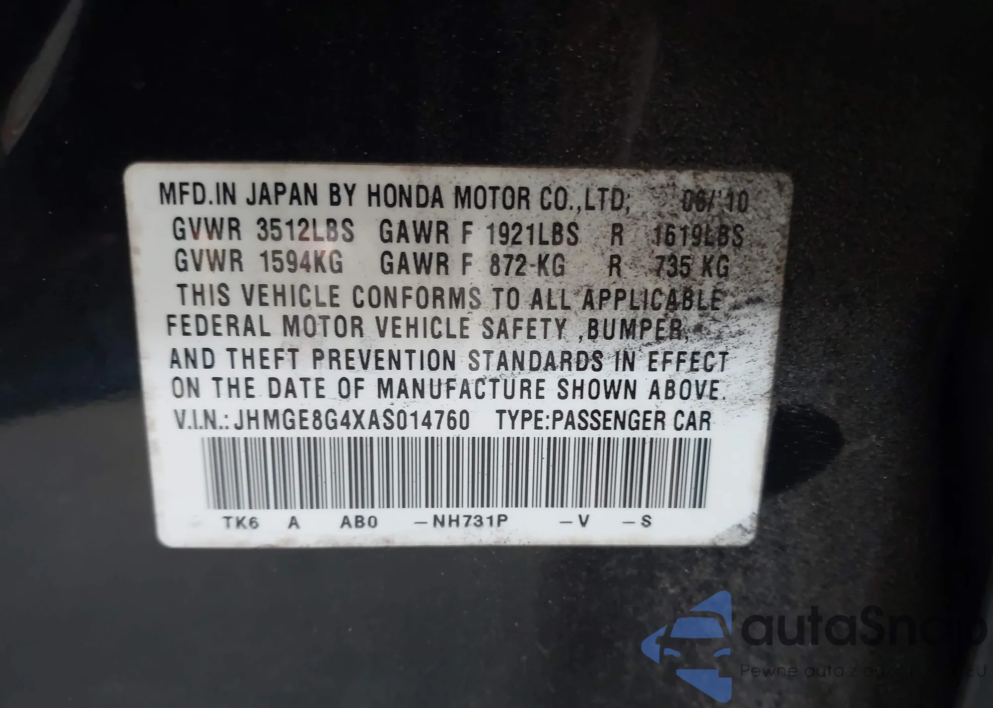 VIN: JHMGE8G4XAS014760