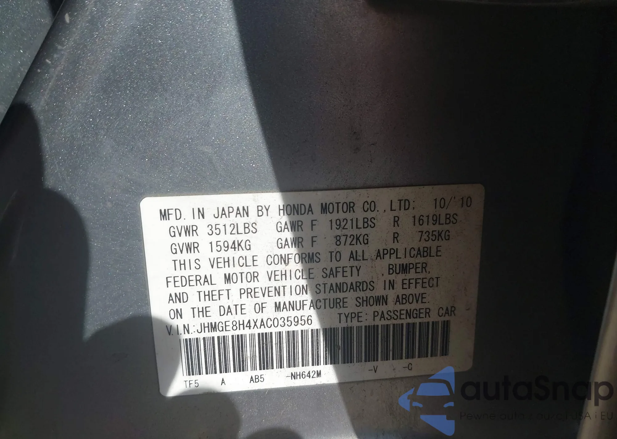 Автомобиль Honda Fit 2010 (VIN JHMGE8H4XAC035956) ранее не участвовал в торгах. Документы чистые, пробег соответствует или ниже среднего по рынку. Продаётся страховой компанией — рекомендуем покупку. Доставка в порт займет около 6–8 недель.