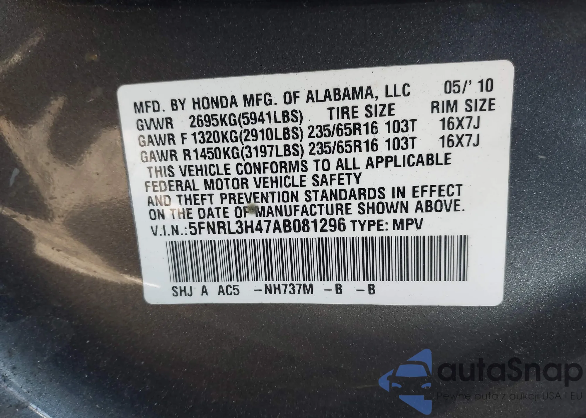 • VIN: 5FNRL3H47AB081296