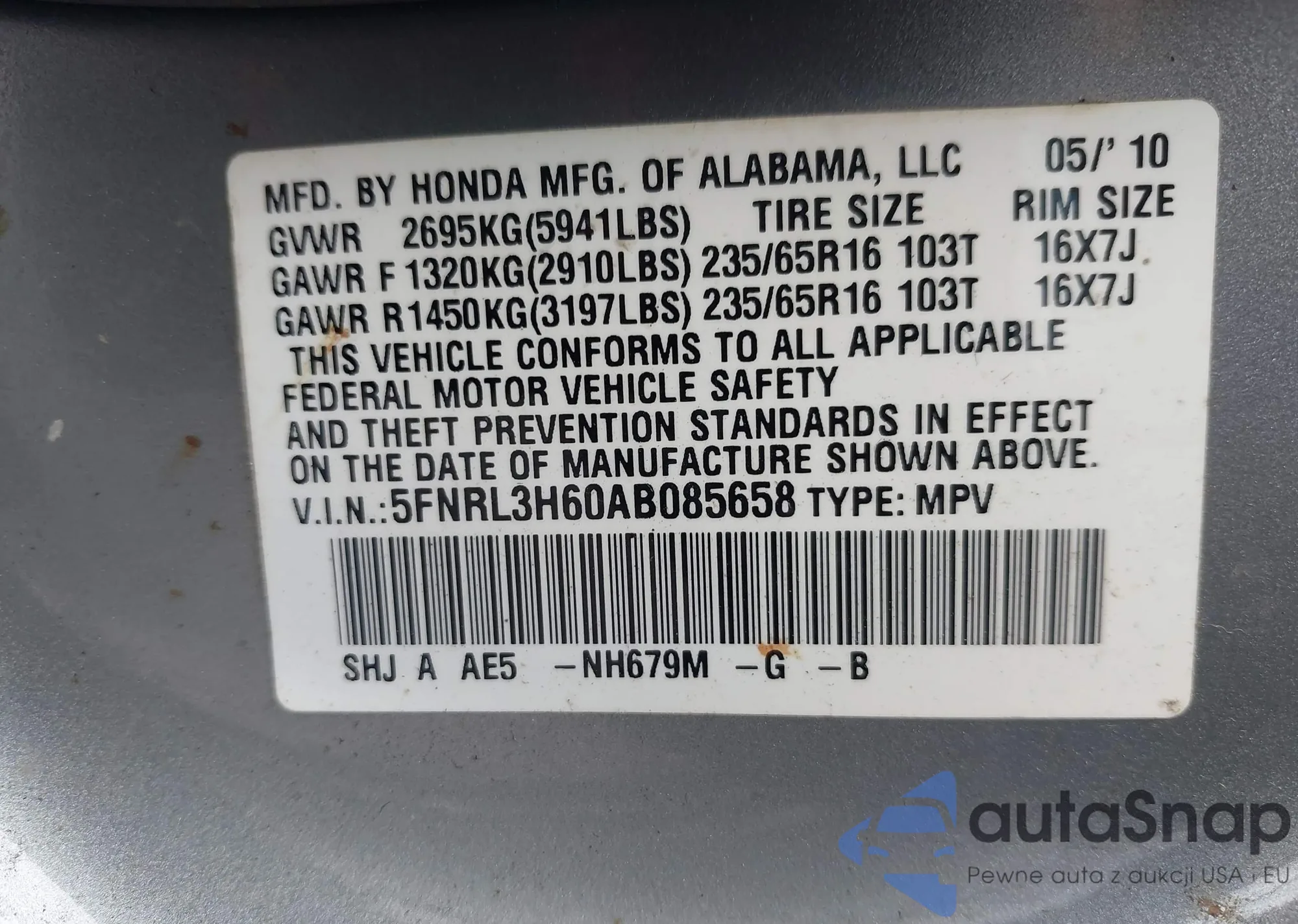 VIN: 5FNRL3H60AB085658