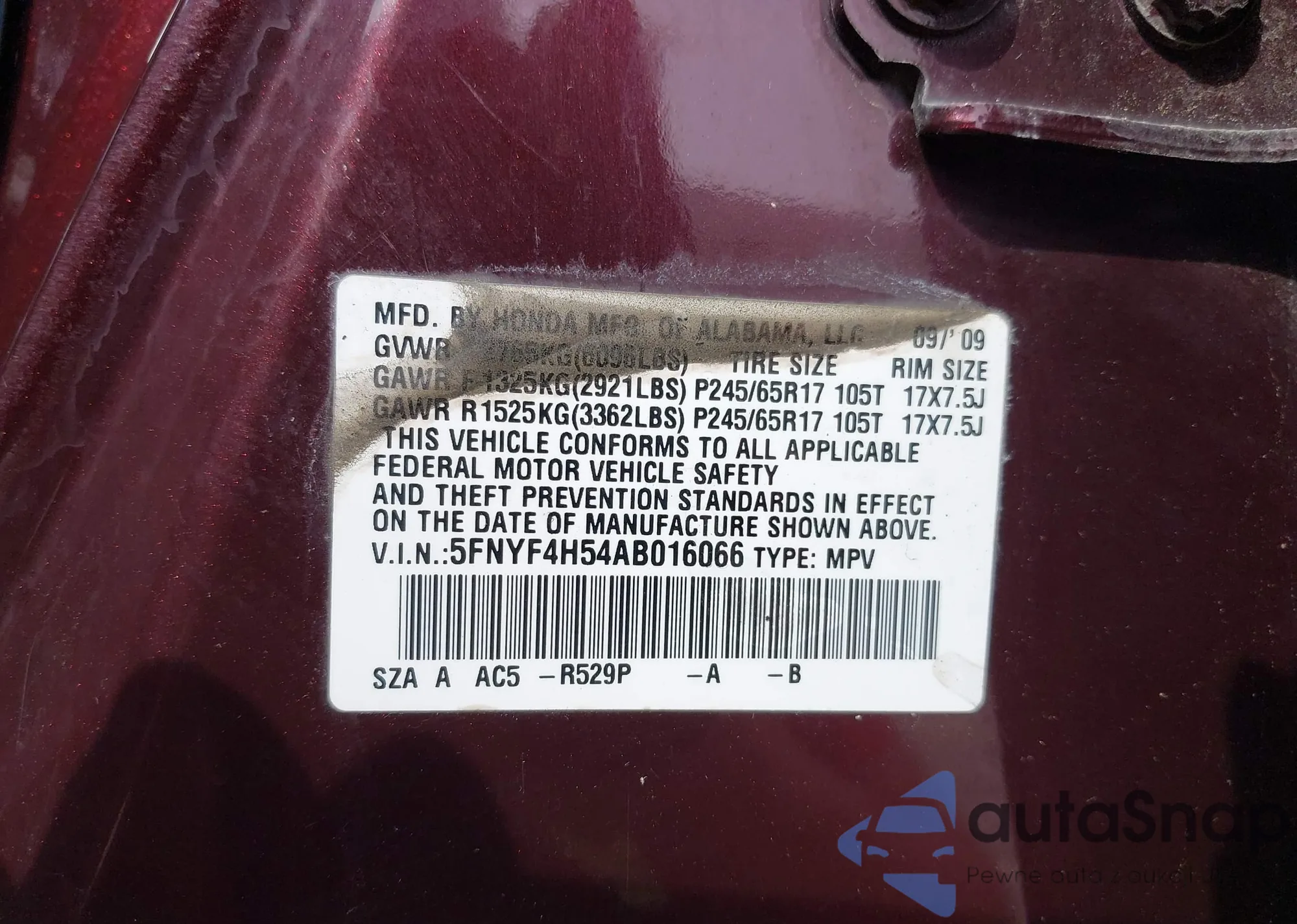 VIN: 5FNYF4H54AB016066