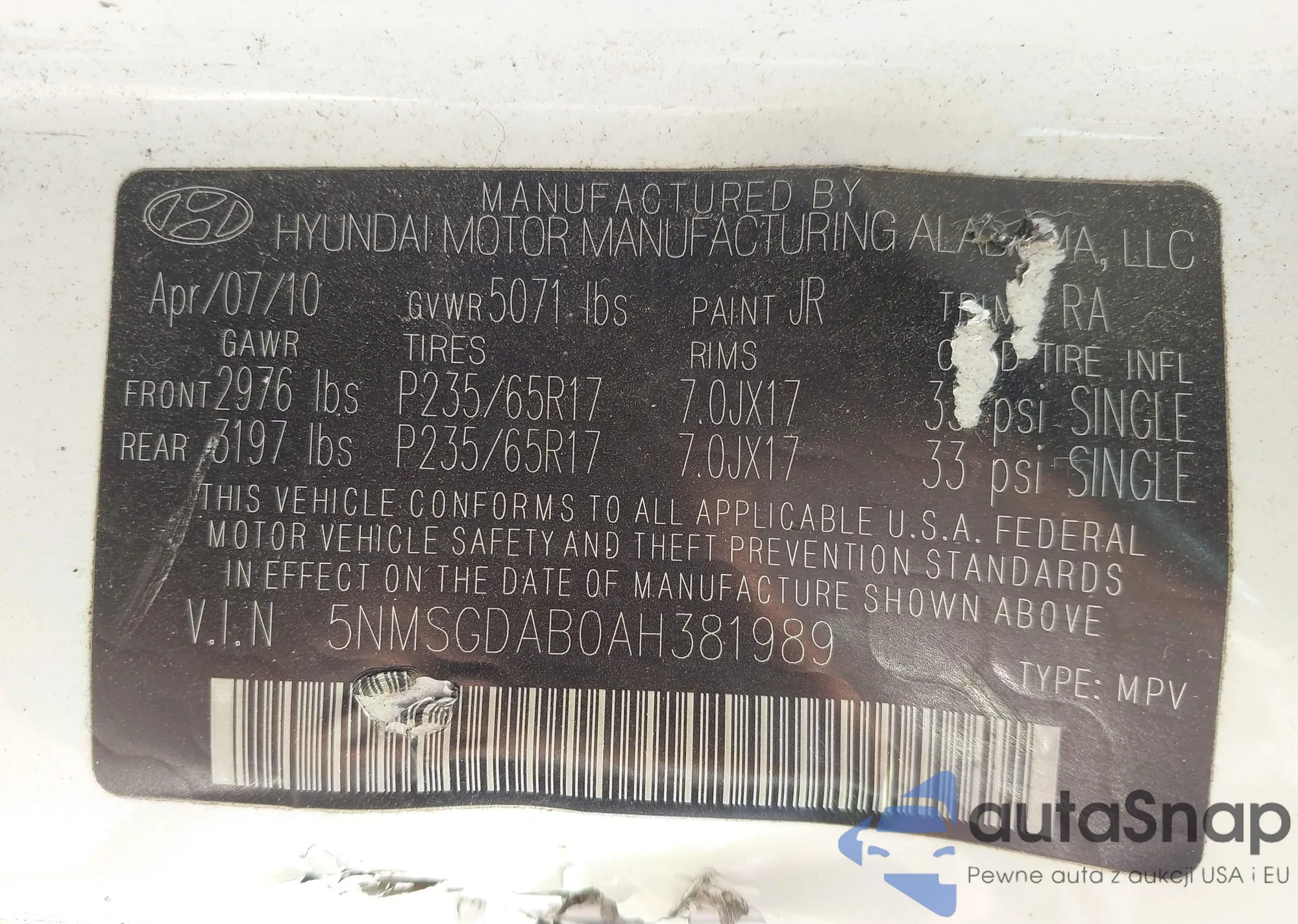 VIN: 5NMSGDAB0AH381989