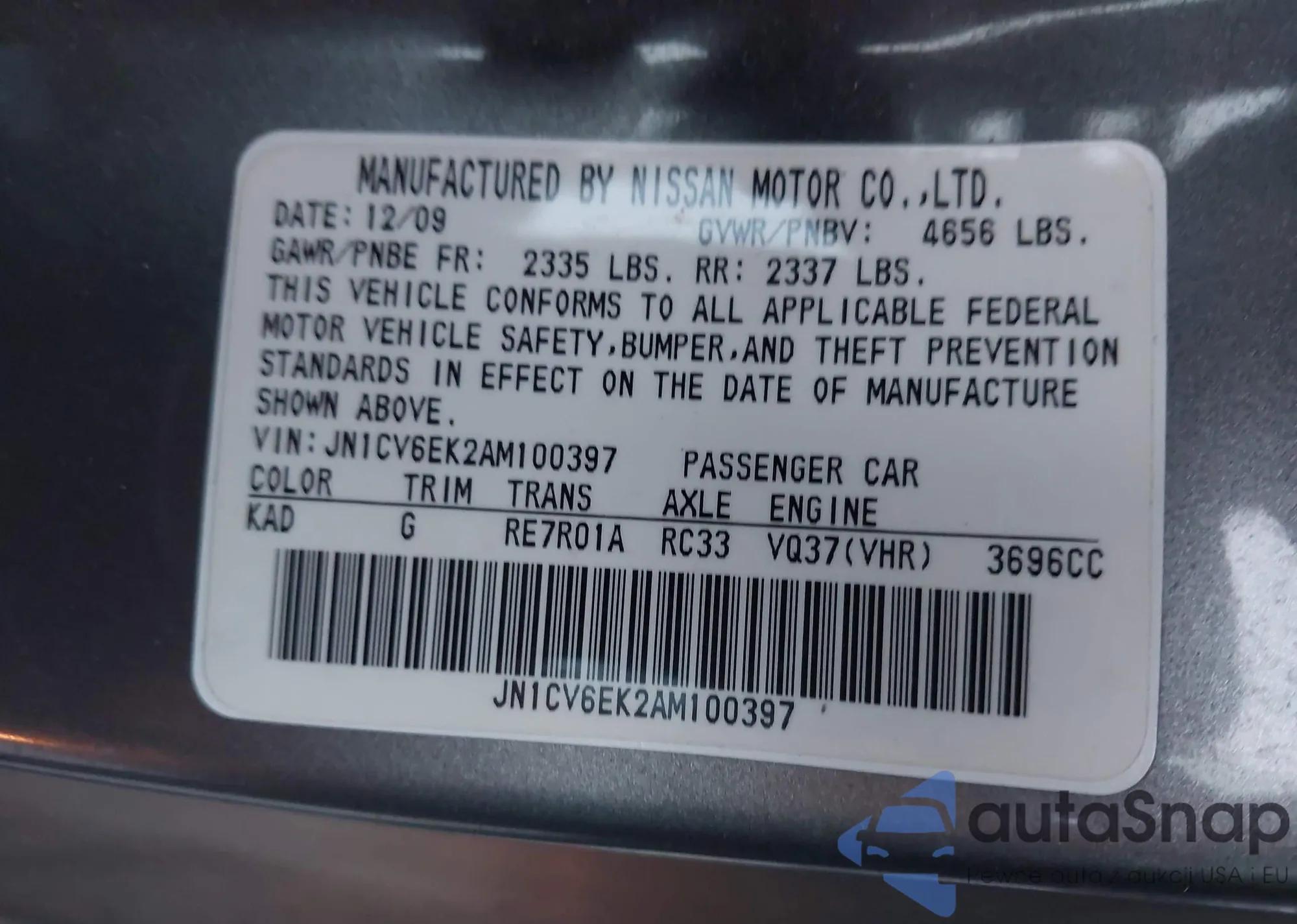 Автомобиль Infiniti G 2010 (VIN JN1CV6EK2AM100397) ранее не участвовал в торгах. Документы чистые, пробег соответствует или ниже среднего по рынку. Продаётся страховой компанией — рекомендуем покупку. Доставка в порт займет около 6–8 недель.