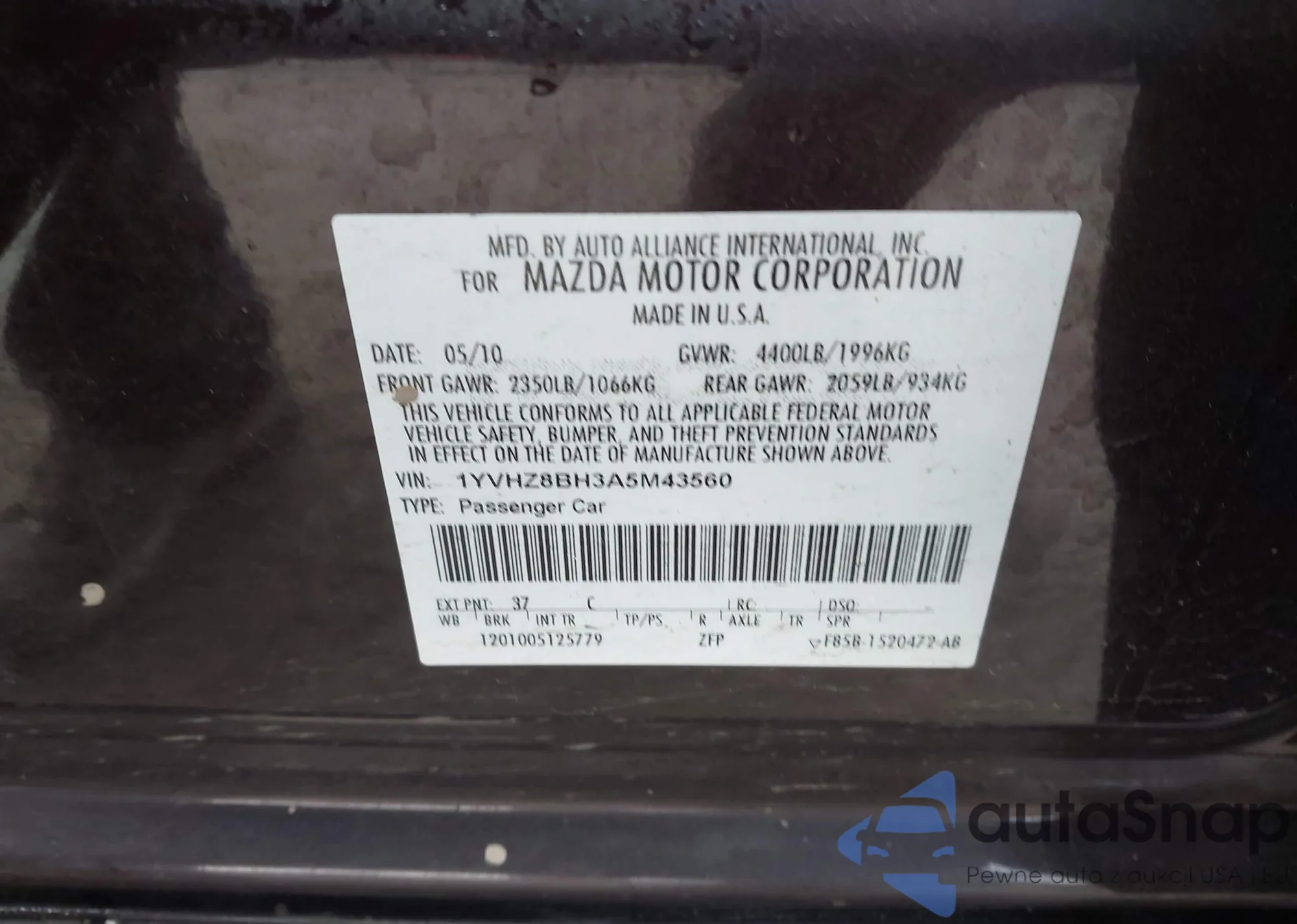 VIN: 1YVHZ8BH3A5M43560