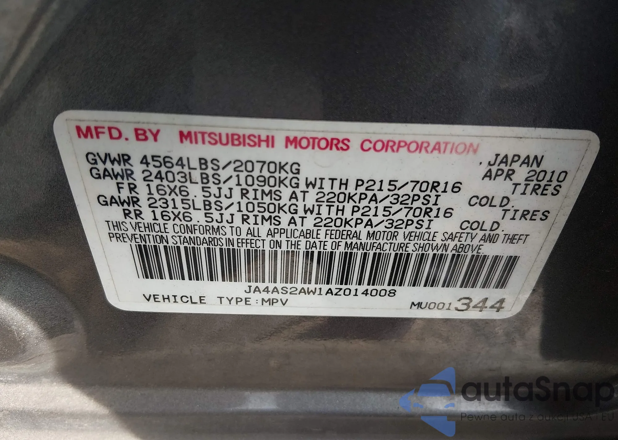 VIN: JA4AS2AW1AZ014008