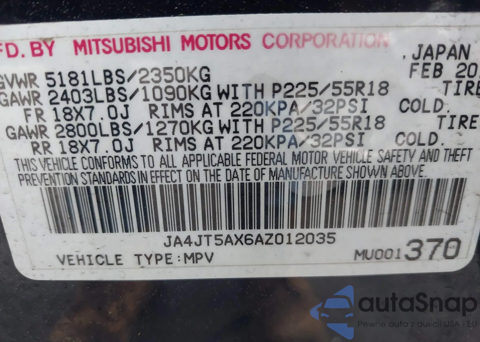 VIN: JA4JT5AX6AZ012035