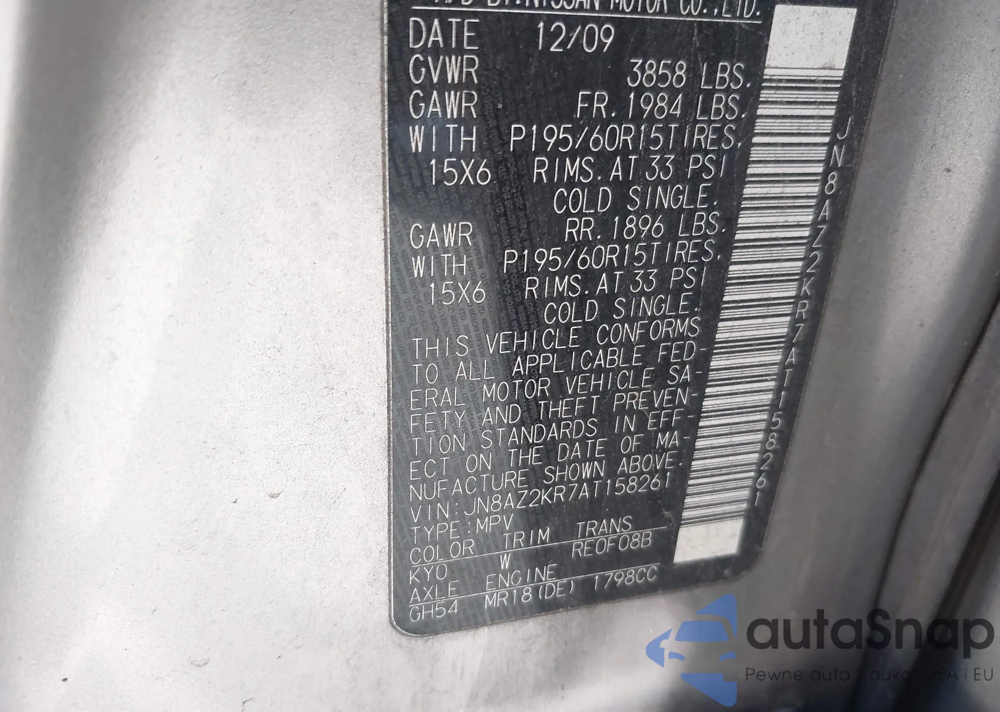 Автомобиль Nissan Cube 2010 (VIN JN8AZ2KR7AT158261) имеет документы, препятствующие регистрации. Могут возникнуть сложности при экспорте и регистрации. Обратитесь к экспертам AutaSnap для поиска альтернатив.