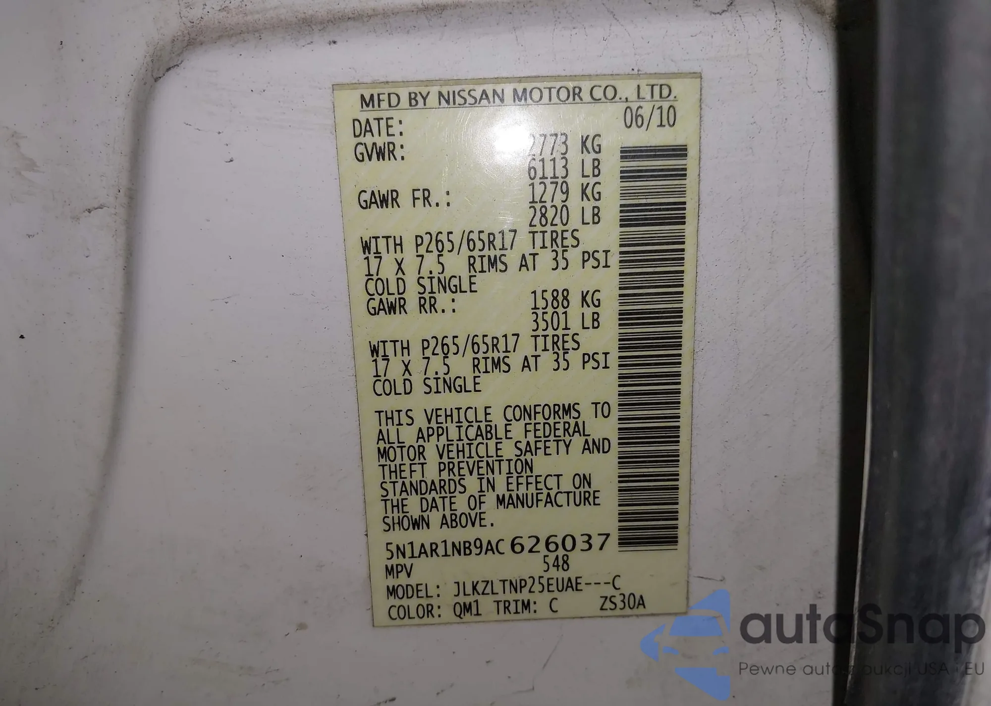 • VIN: 5N1AR1NB9AC626037