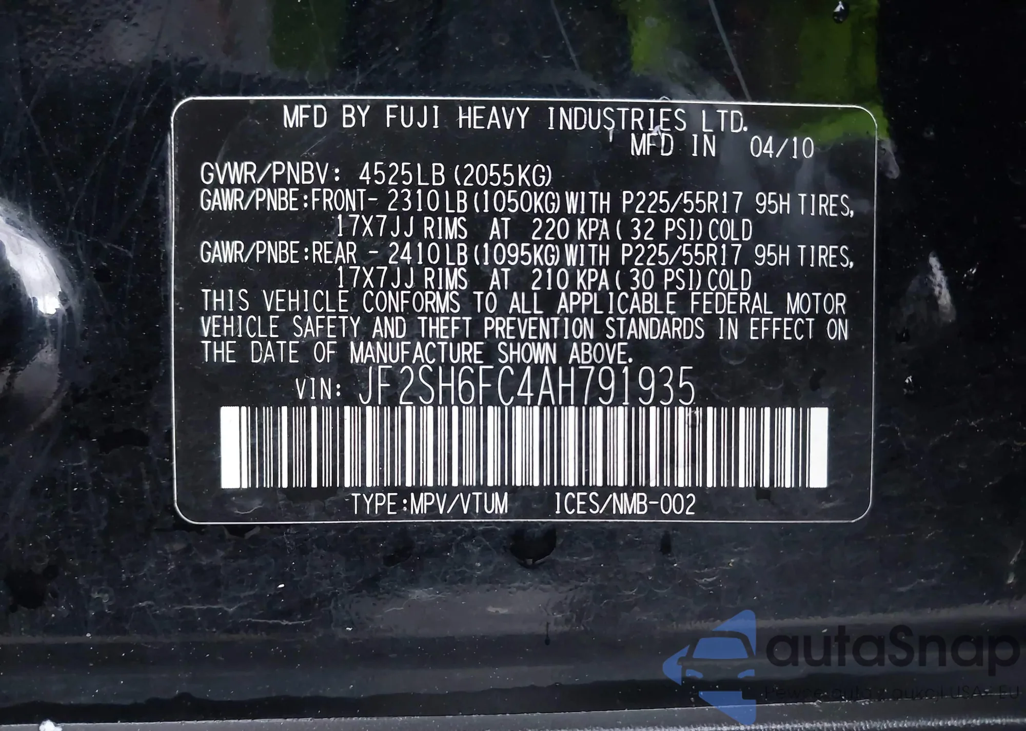 Автомобиль Subaru Forester 2010 (VIN JF2SH6FC4AH791935) имеет документы, препятствующие регистрации. Могут возникнуть сложности при экспорте и регистрации. Обратитесь к экспертам AutaSnap для поиска альтернатив.