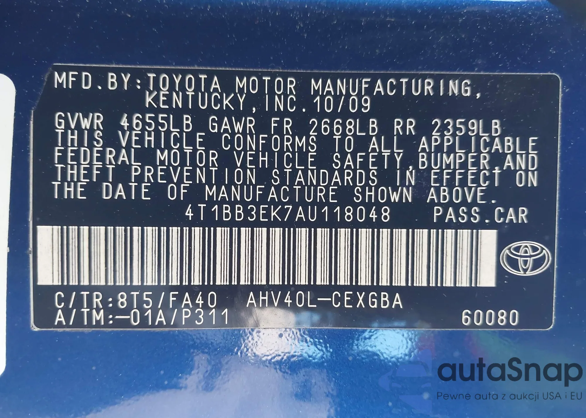 Автомобиль Toyota Camry 2010 (VIN 4T1BB3EK7AU118048) ранее не участвовал в торгах. Документы чистые, пробег соответствует или ниже среднего по рынку. Продаётся страховой компанией — рекомендуем покупку. Доставка в порт займет около 6–8 недель.