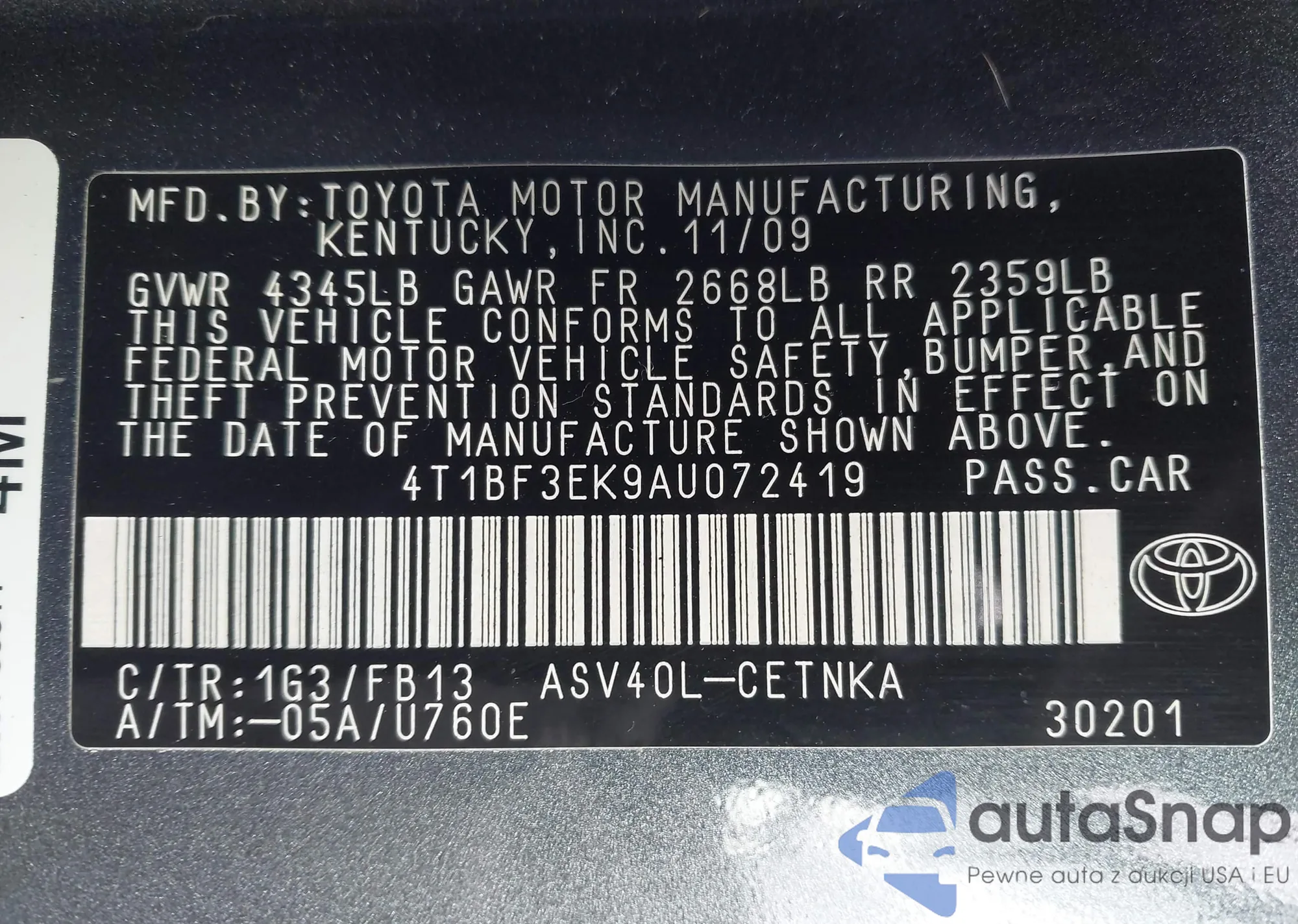 VIN: 4T1BF3EK9AU072419