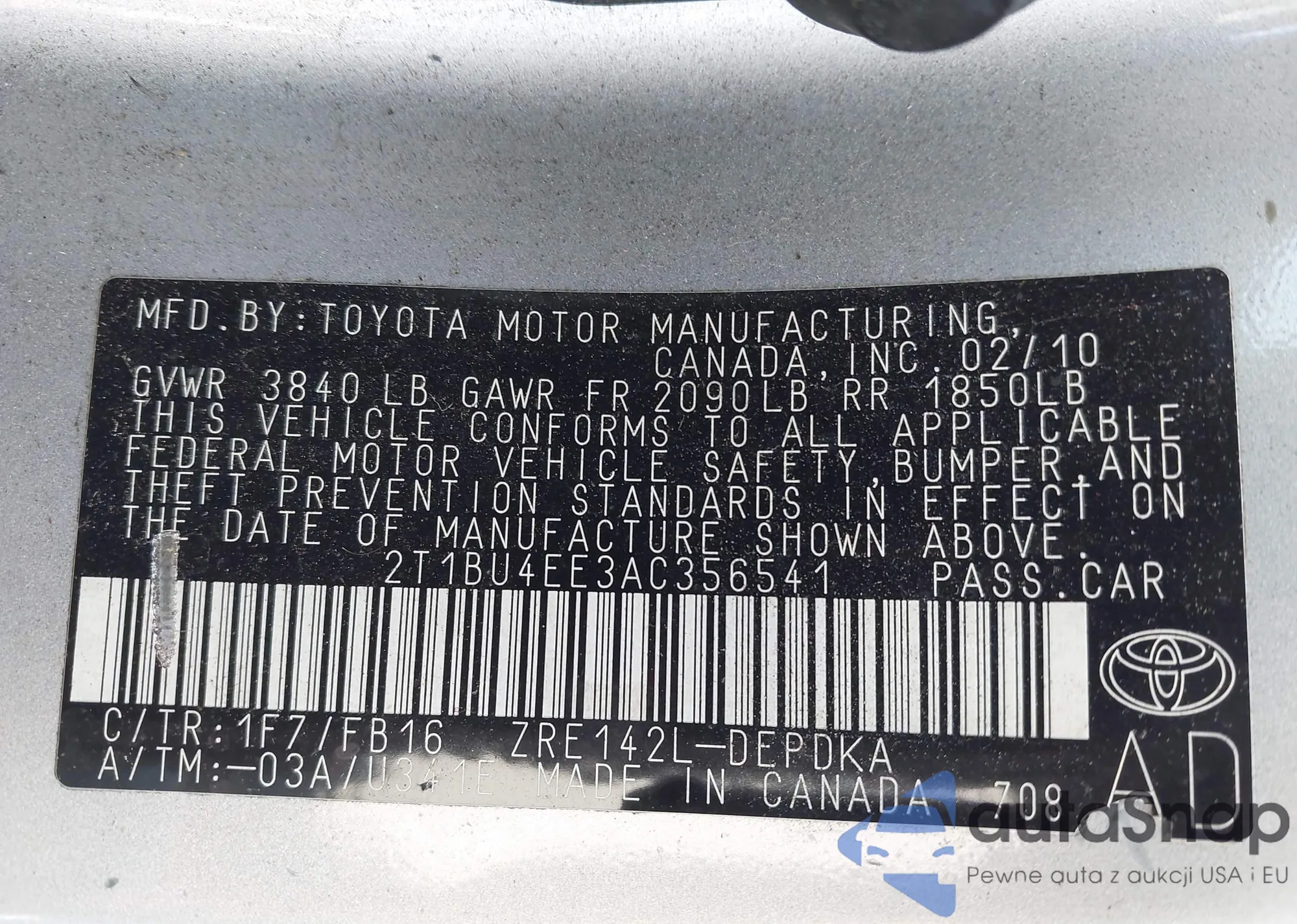 Автомобиль Toyota Corolla 2010 (VIN 2T1BU4EE3AC356541) ранее не участвовал в торгах. Документы чистые, пробег соответствует или ниже среднего по рынку. Продаётся страховой компанией — рекомендуем покупку. Доставка в порт займет около 6–8 недель.