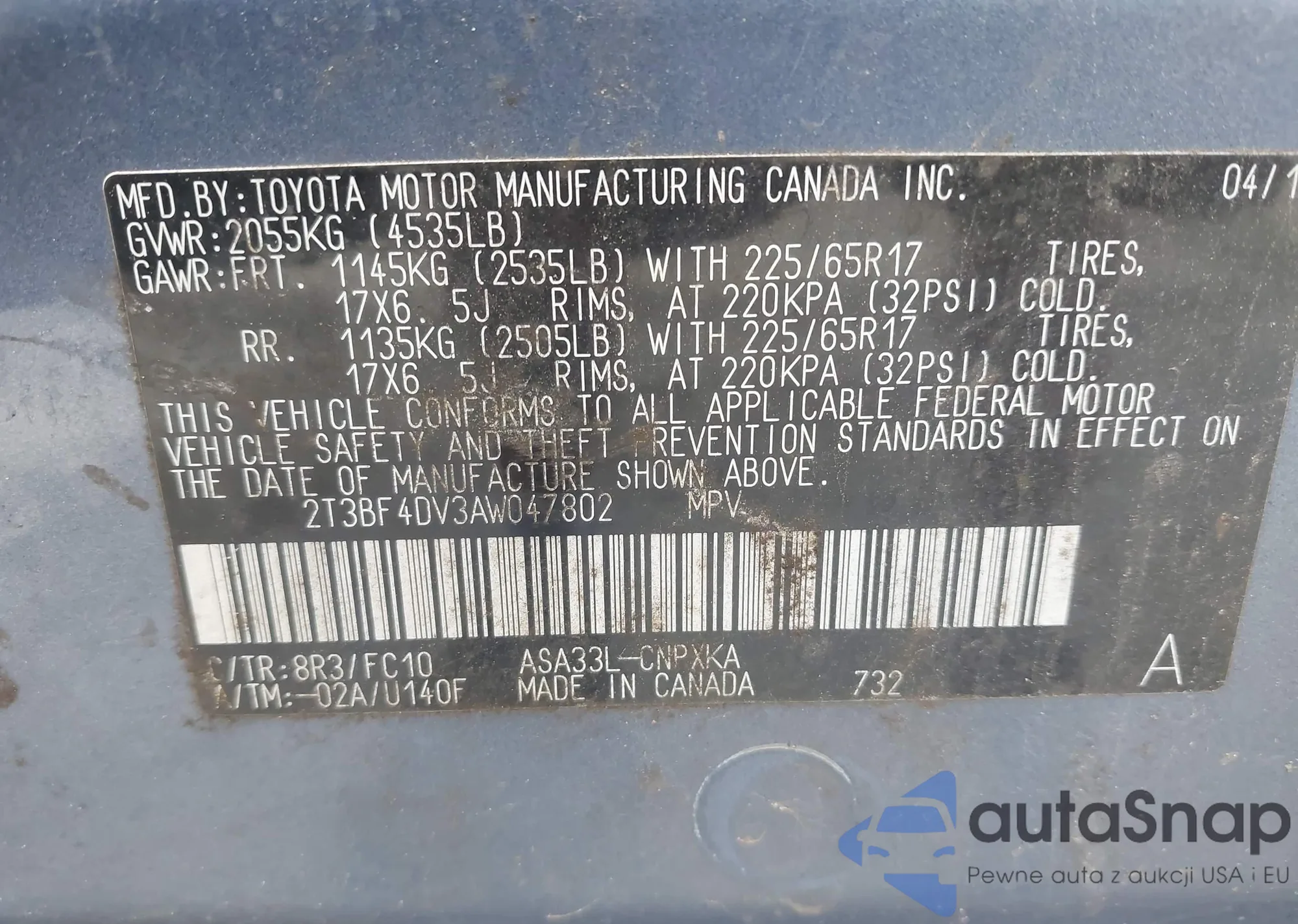 VIN: 2T3BF4DV3AW047802