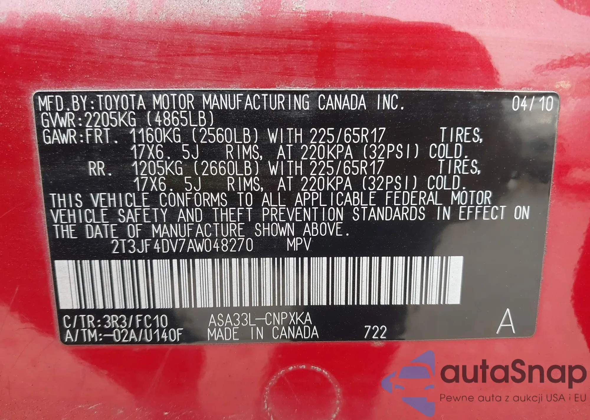 • VIN: 2T3JF4DV7AW048270