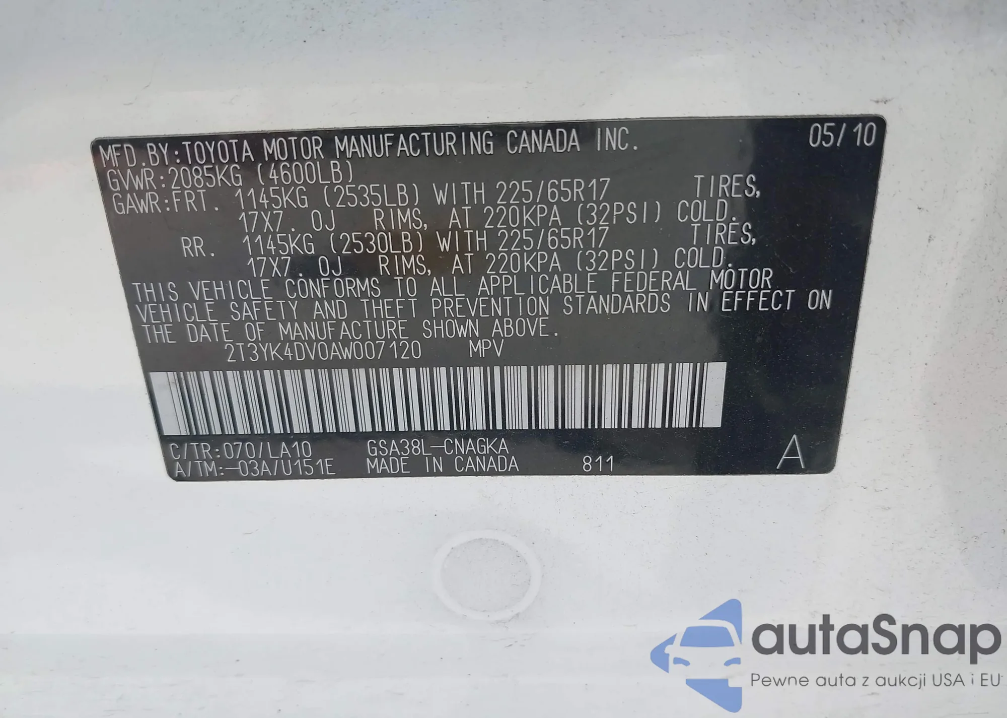 • VIN: 2T3YK4DV0AW007120