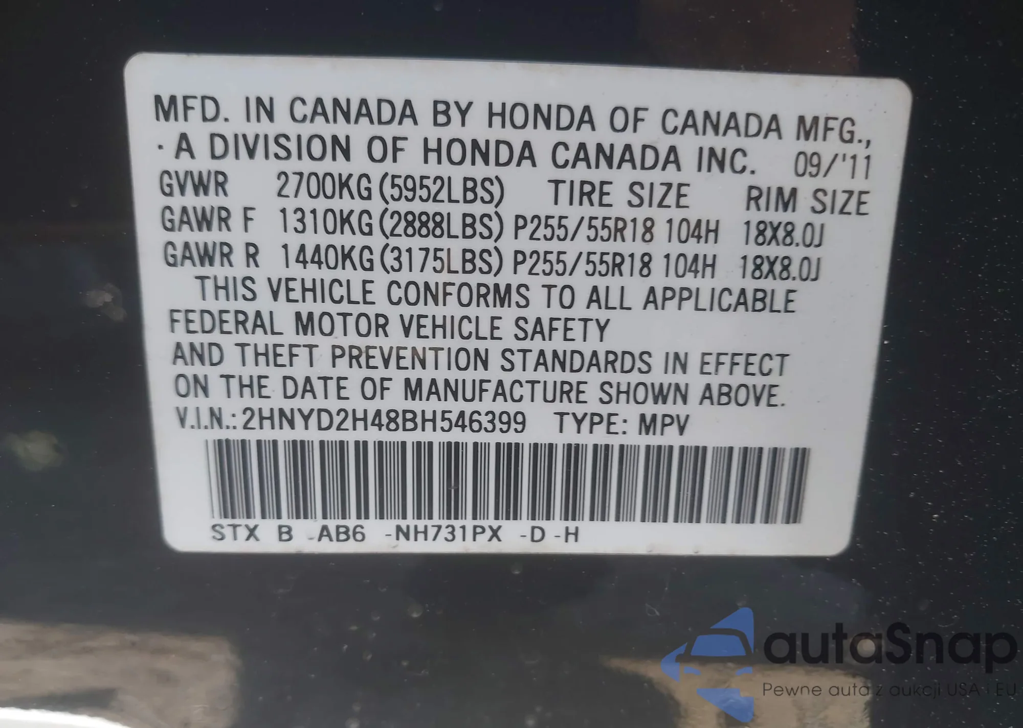 VIN: 2HNYD2H48BH546399