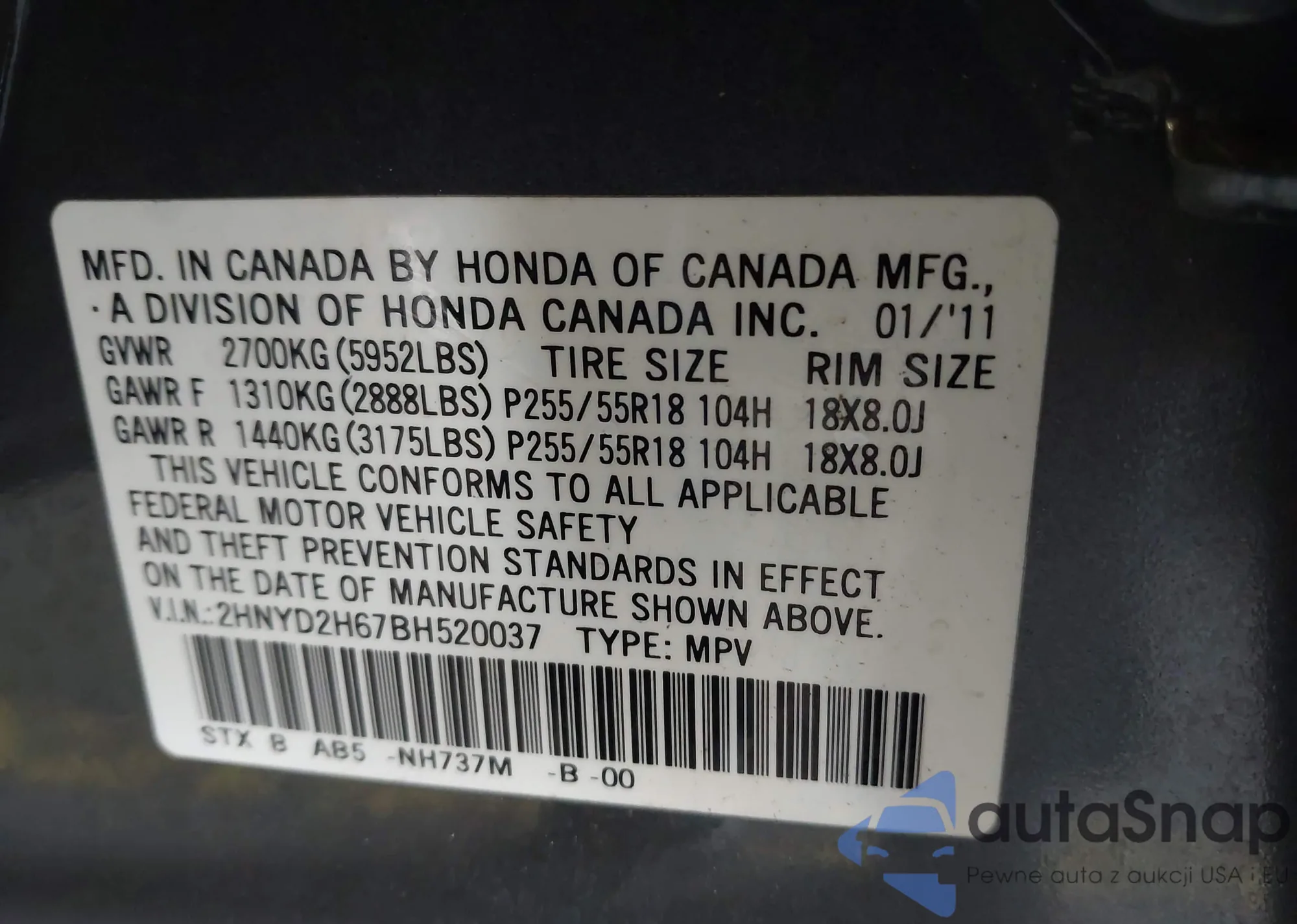 VIN: 2HNYD2H67BH520037