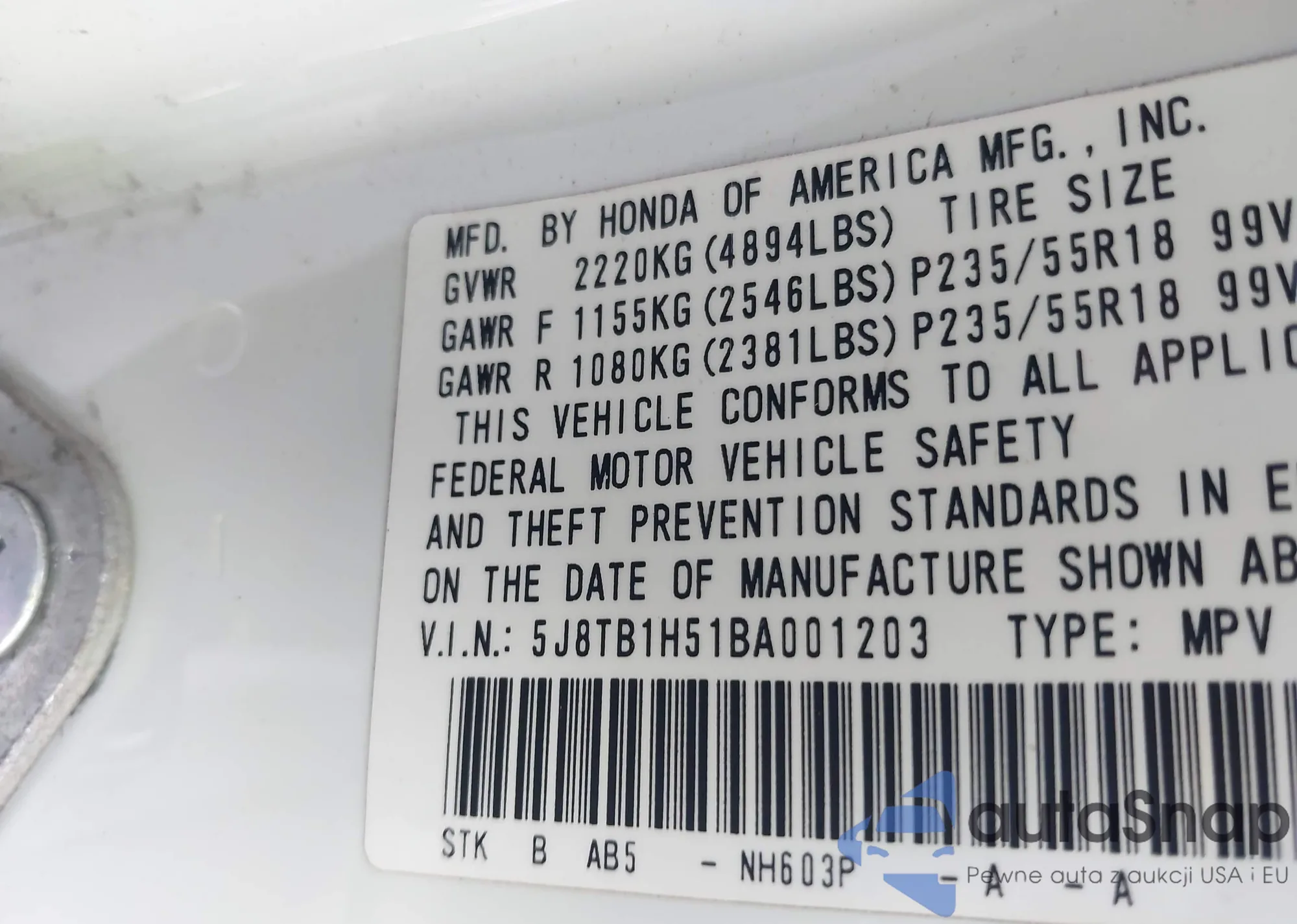 VIN: 5J8TB1H51BA001203