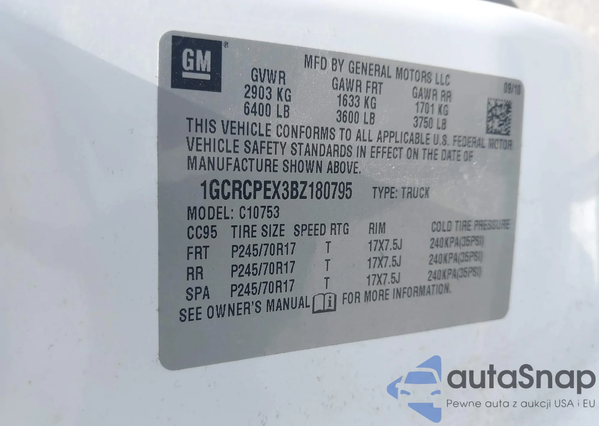 VIN: 1GCRCPEX3BZ180795
