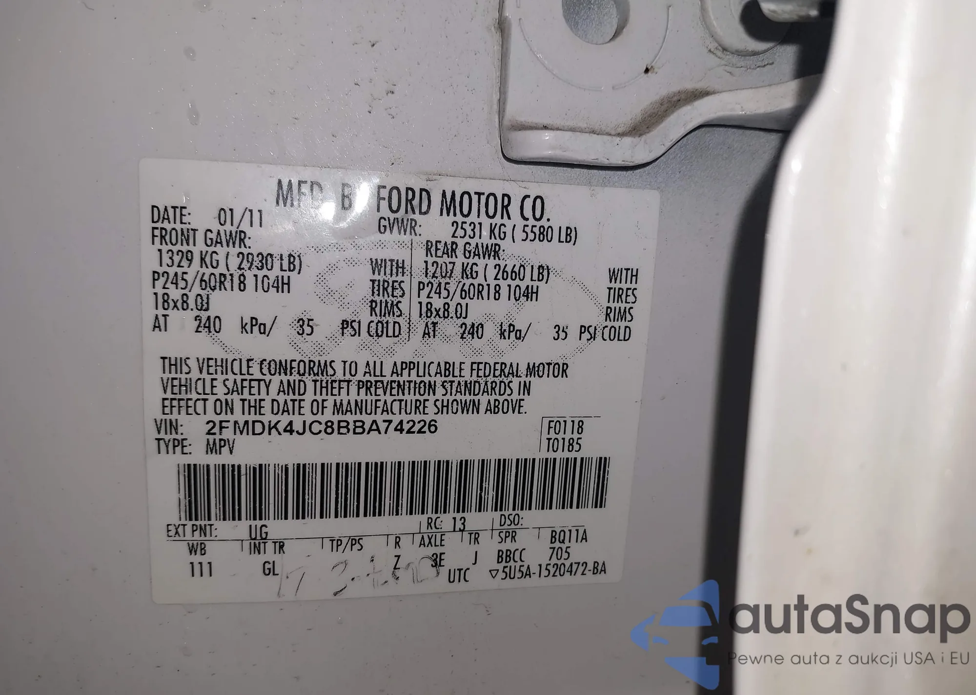 Автомобиль Ford Edge 2011 (VIN 2FMDK4JC8BBA74226) ранее не участвовал в торгах. Документы чистые, пробег соответствует или ниже среднего по рынку. Продаётся страховой компанией — рекомендуем покупку. Доставка в порт займет около 6–8 недель.