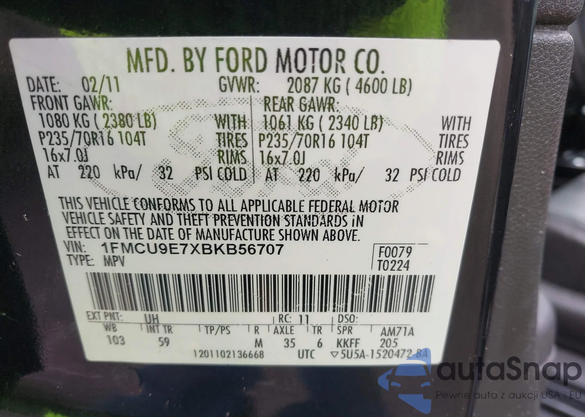 • VIN: 1FMCU9E7XBKB56707