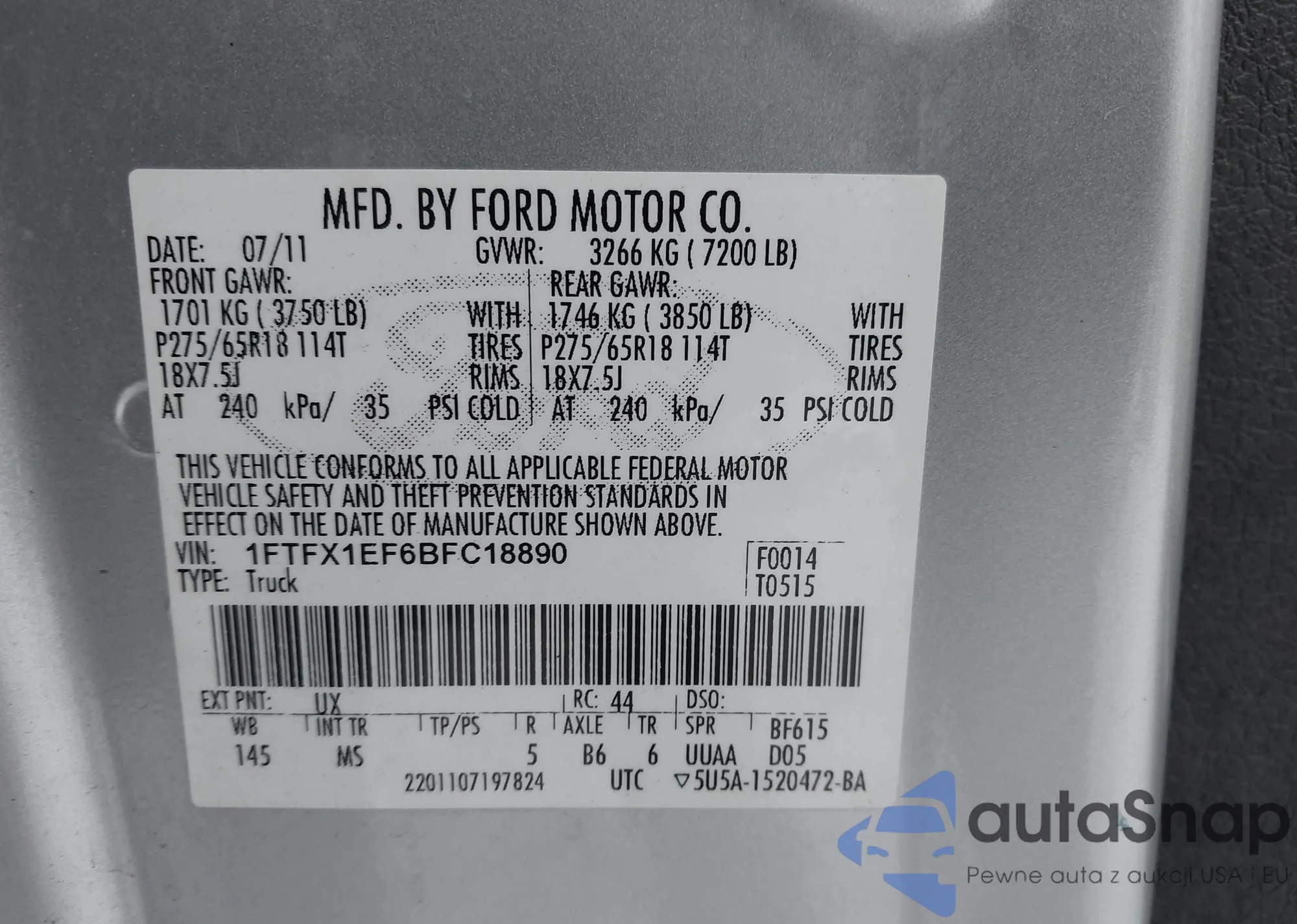 Автомобиль Ford F-150 2011 (VIN 1FTFX1EF6BFC18890) ранее не участвовал в торгах. Документы чистые, пробег соответствует или ниже среднего по рынку. Продаётся страховой компанией — рекомендуем покупку. Доставка в порт займет около 6–8 недель.