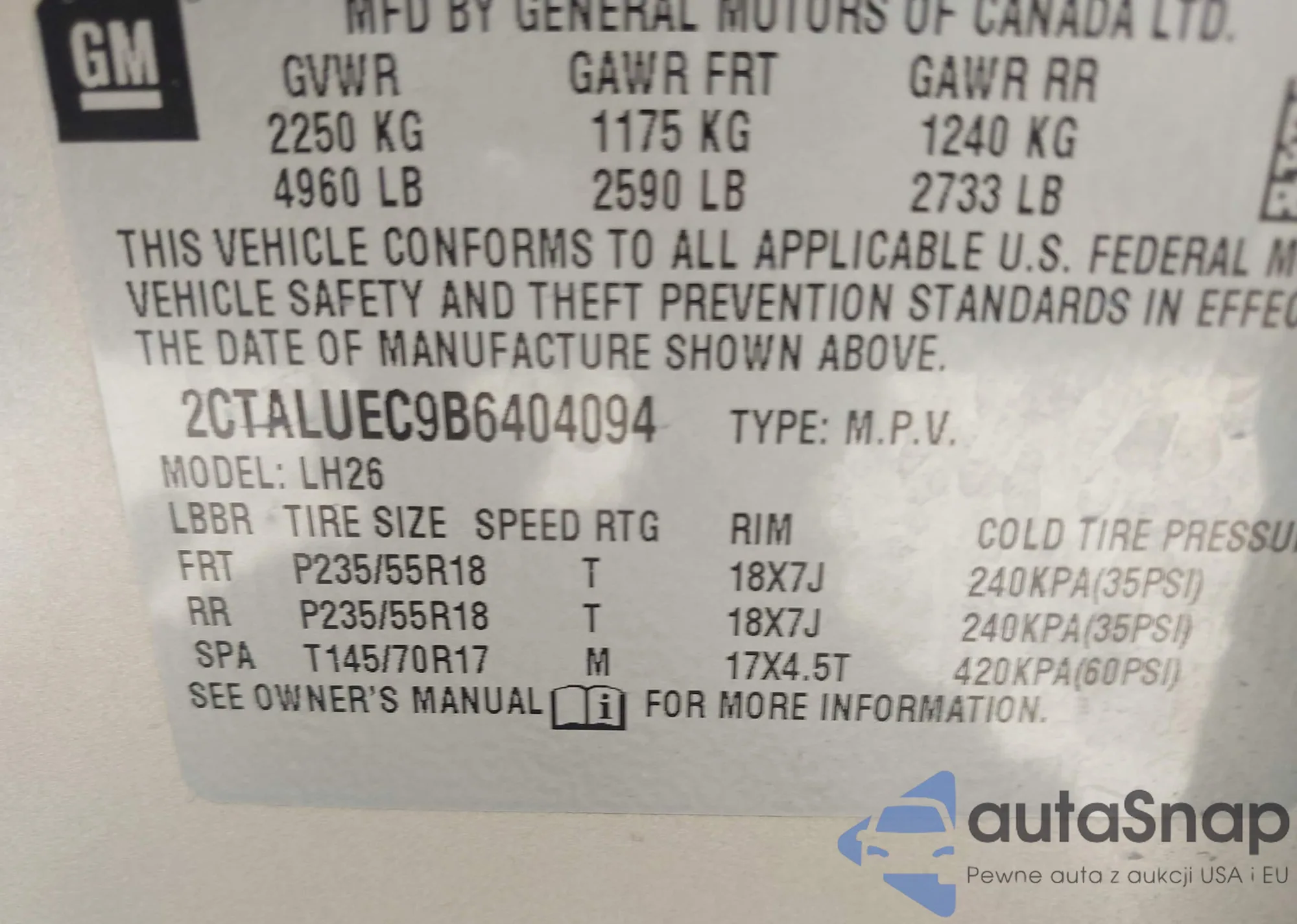 • VIN: 2CTALUEC9B6404094