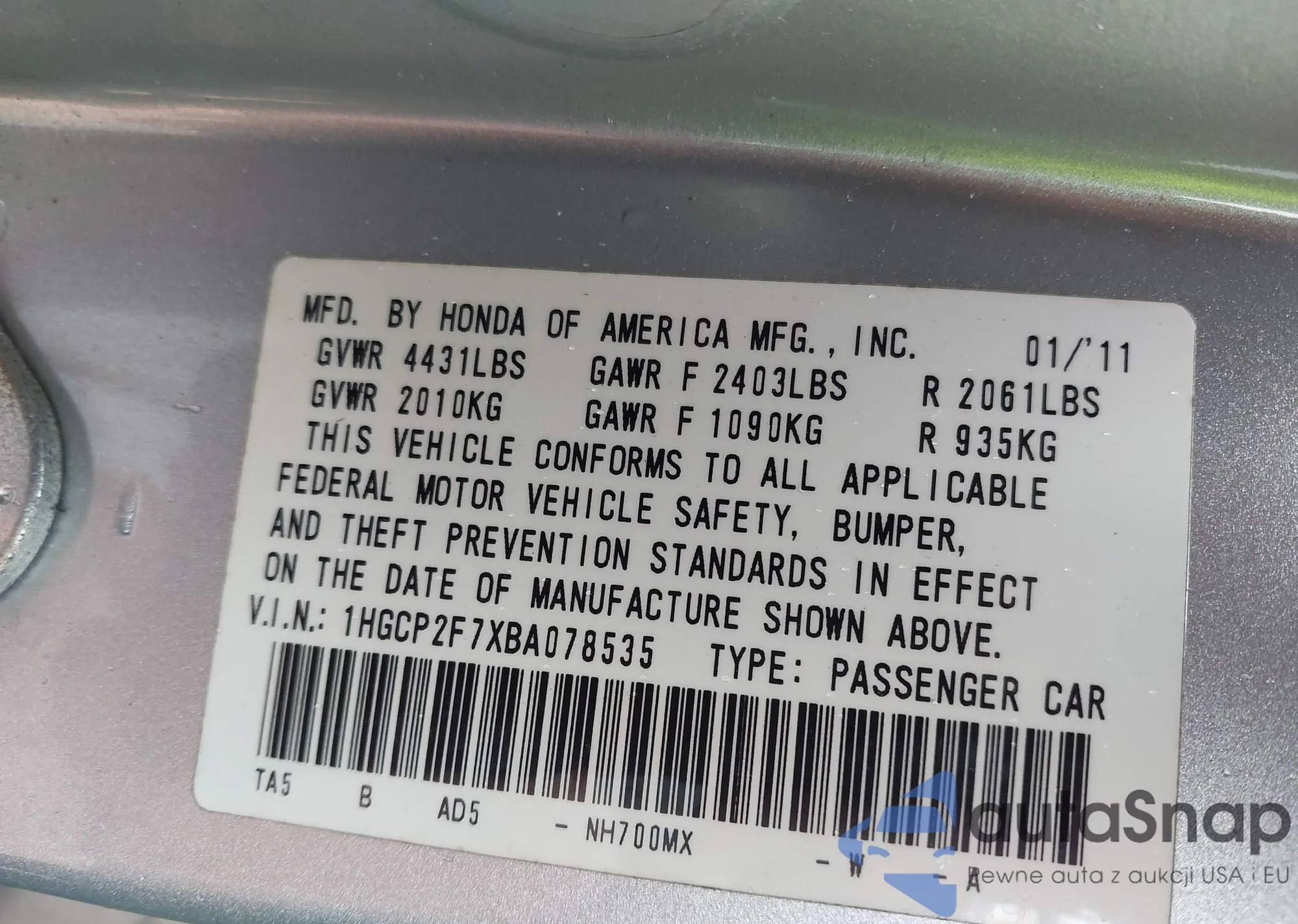 VIN: 1HGCP2F7XBA078535