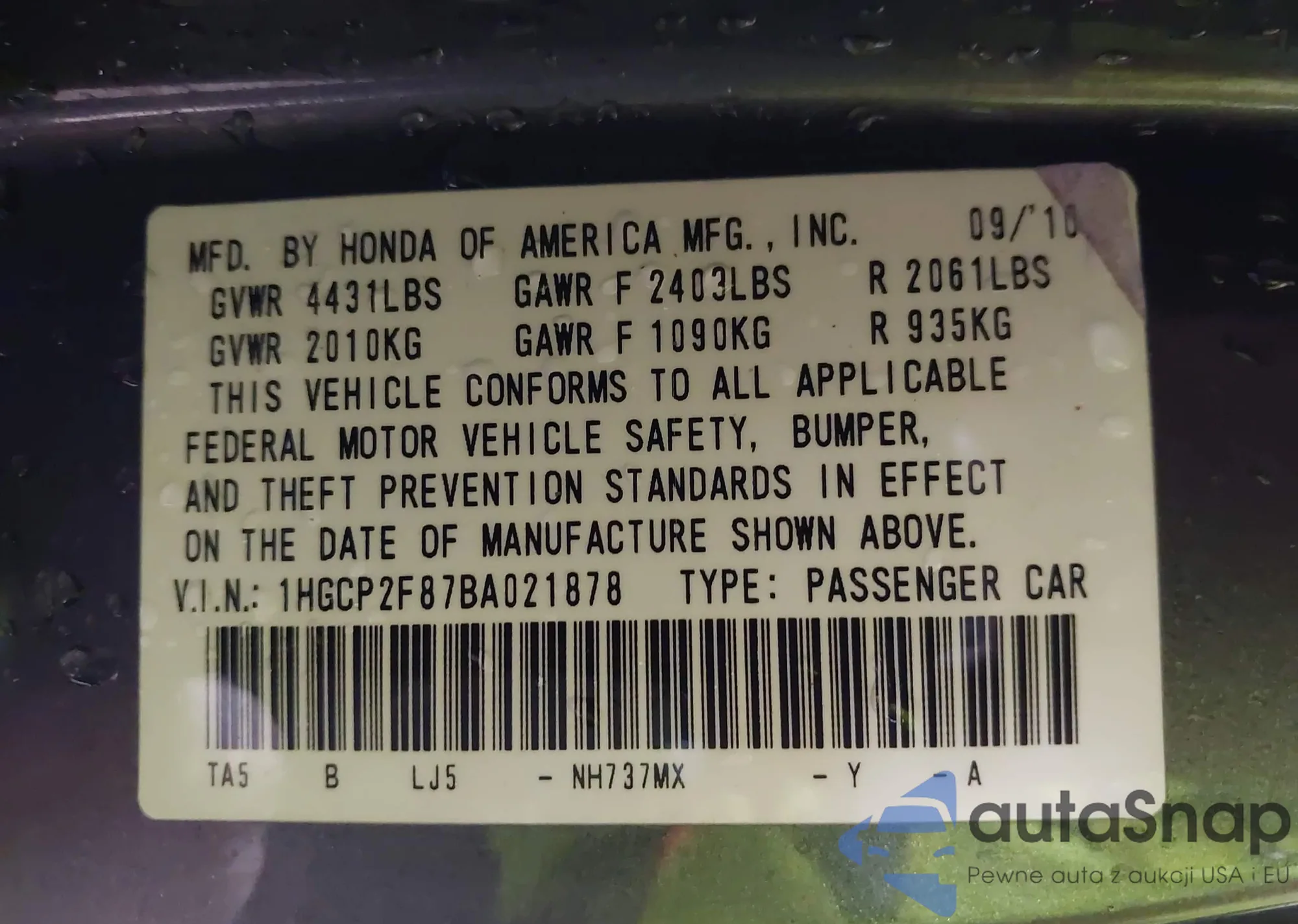 VIN: 1HGCP2F87BA021878