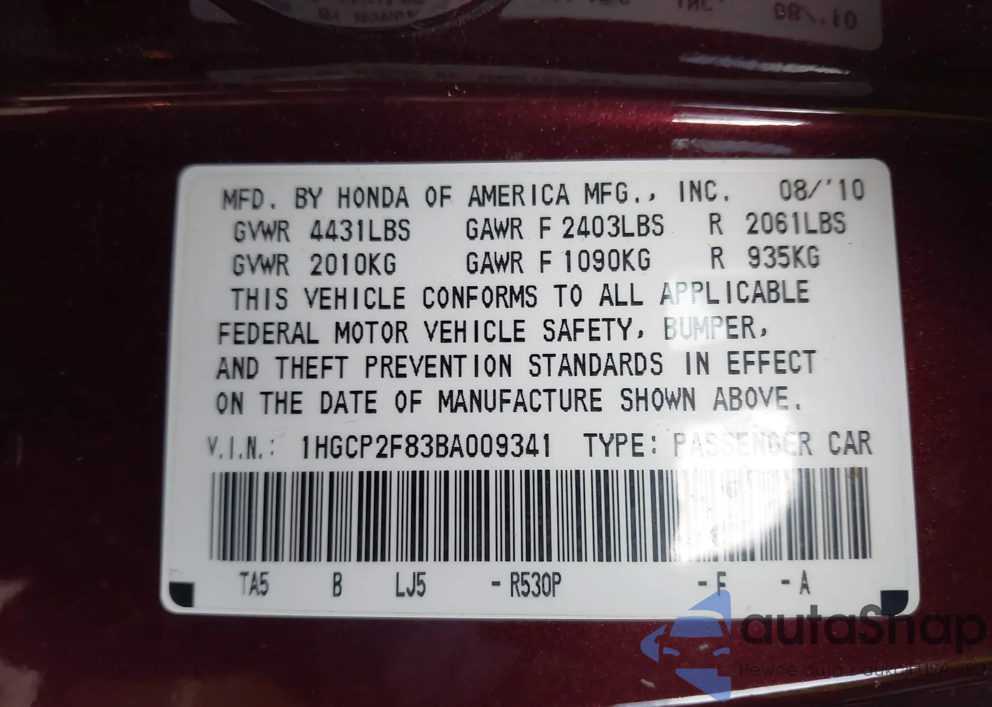 VIN: 1HGCP2F83BA009341