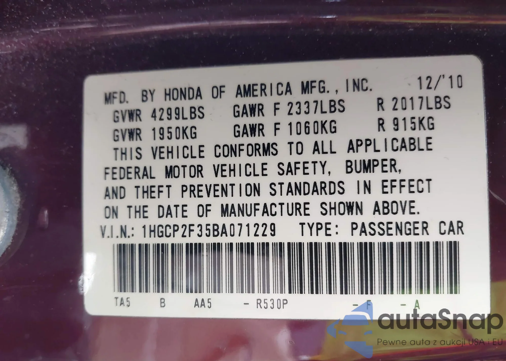 VIN: 1HGCP2F35BA071229
