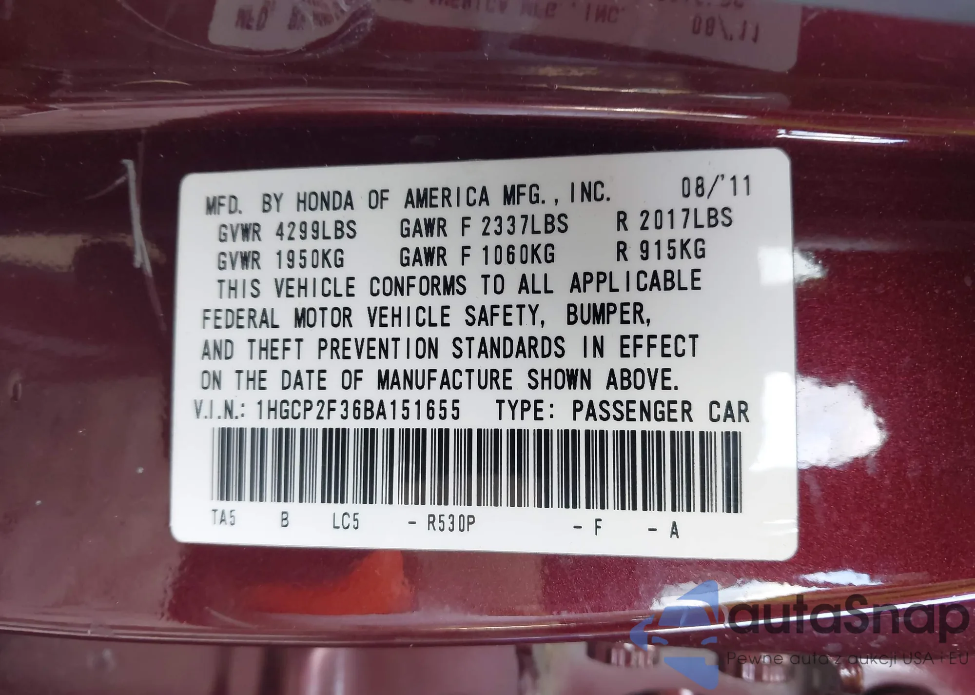• VIN: 1HGCP2F36BA151655