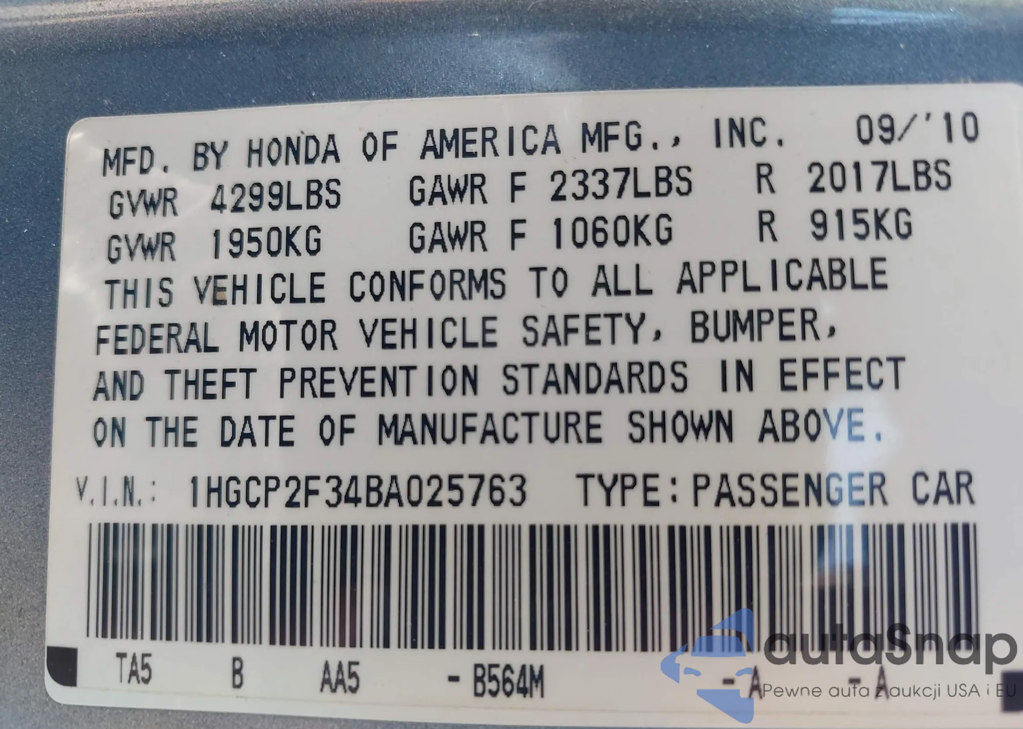 VIN: 1HGCP2F34BA025763