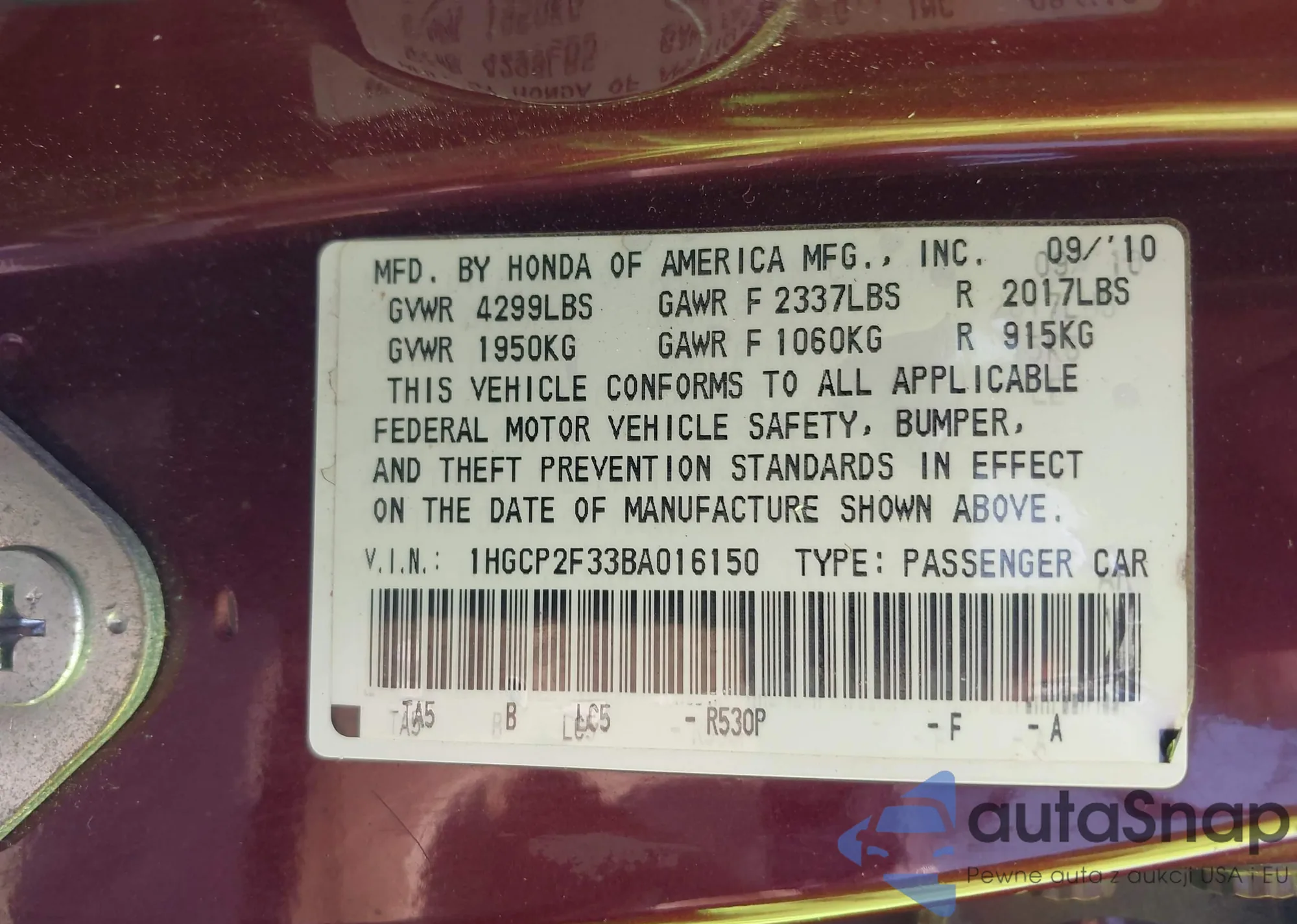 VIN: 1HGCP2F33BA016150