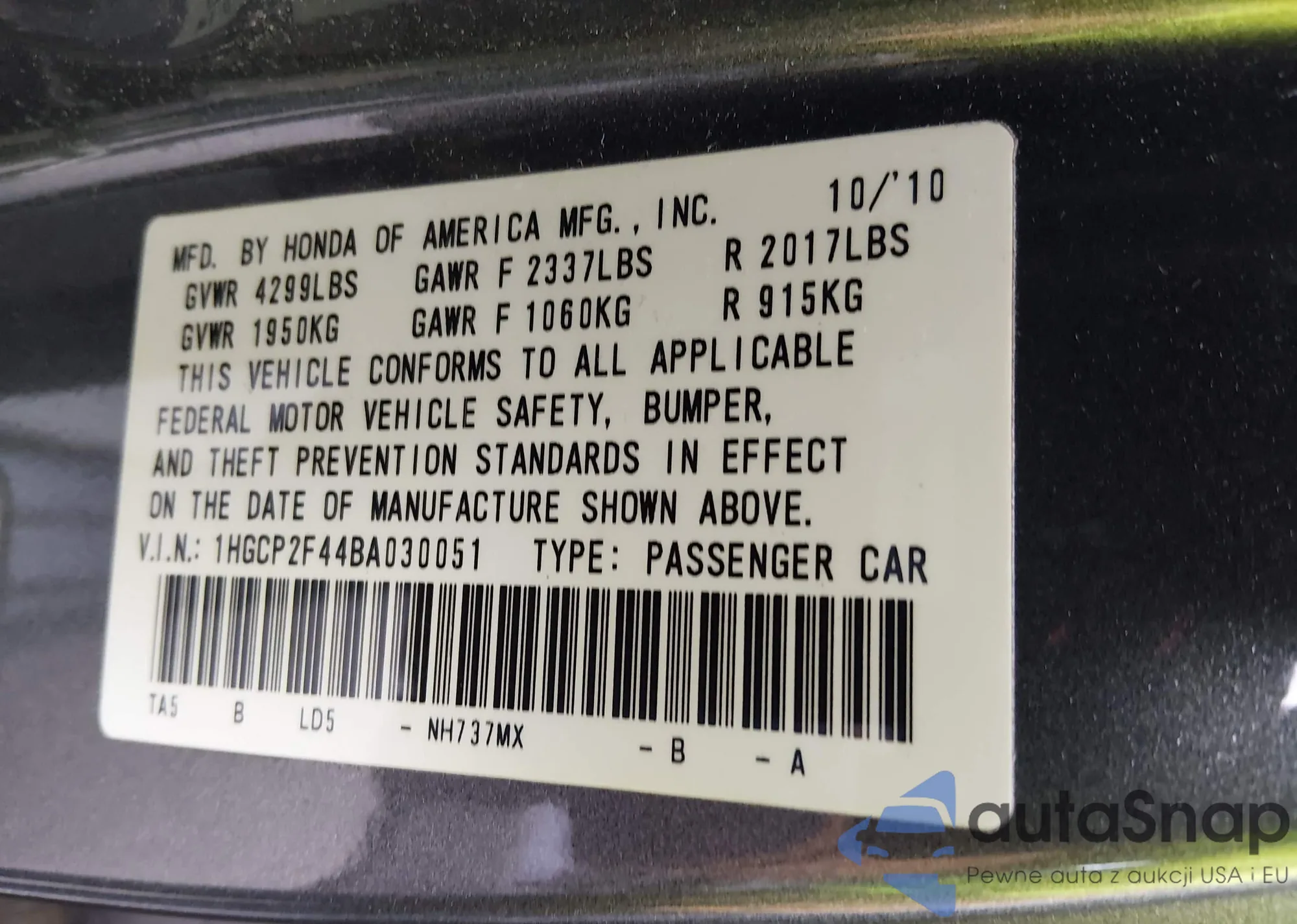 VIN: 1HGCP2F44BA030051