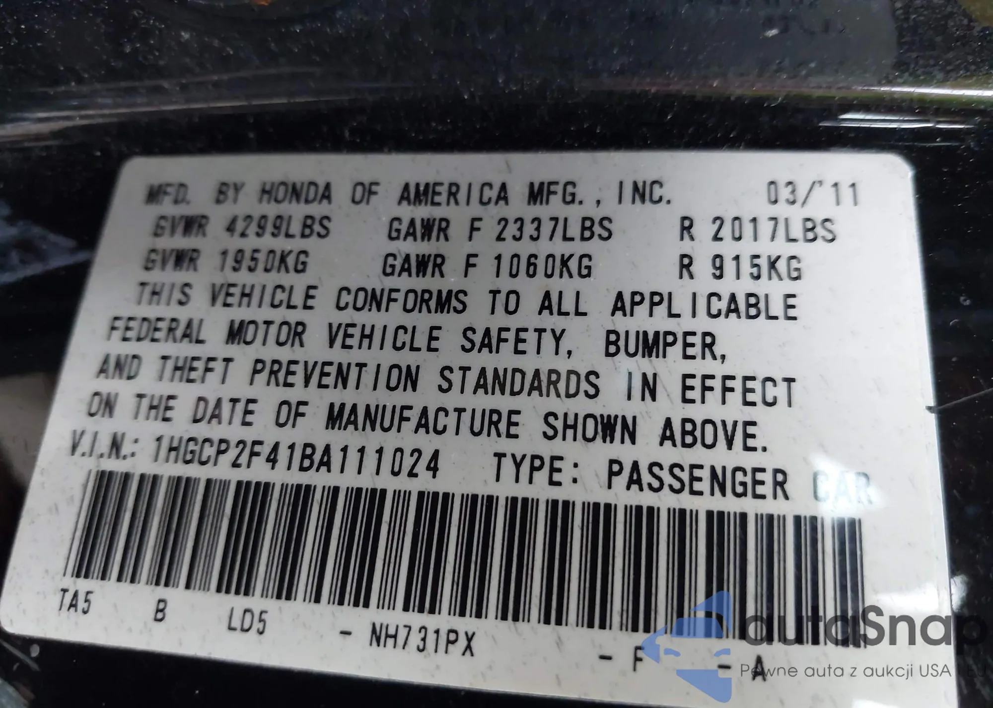 VIN: 1HGCP2F41BA111024