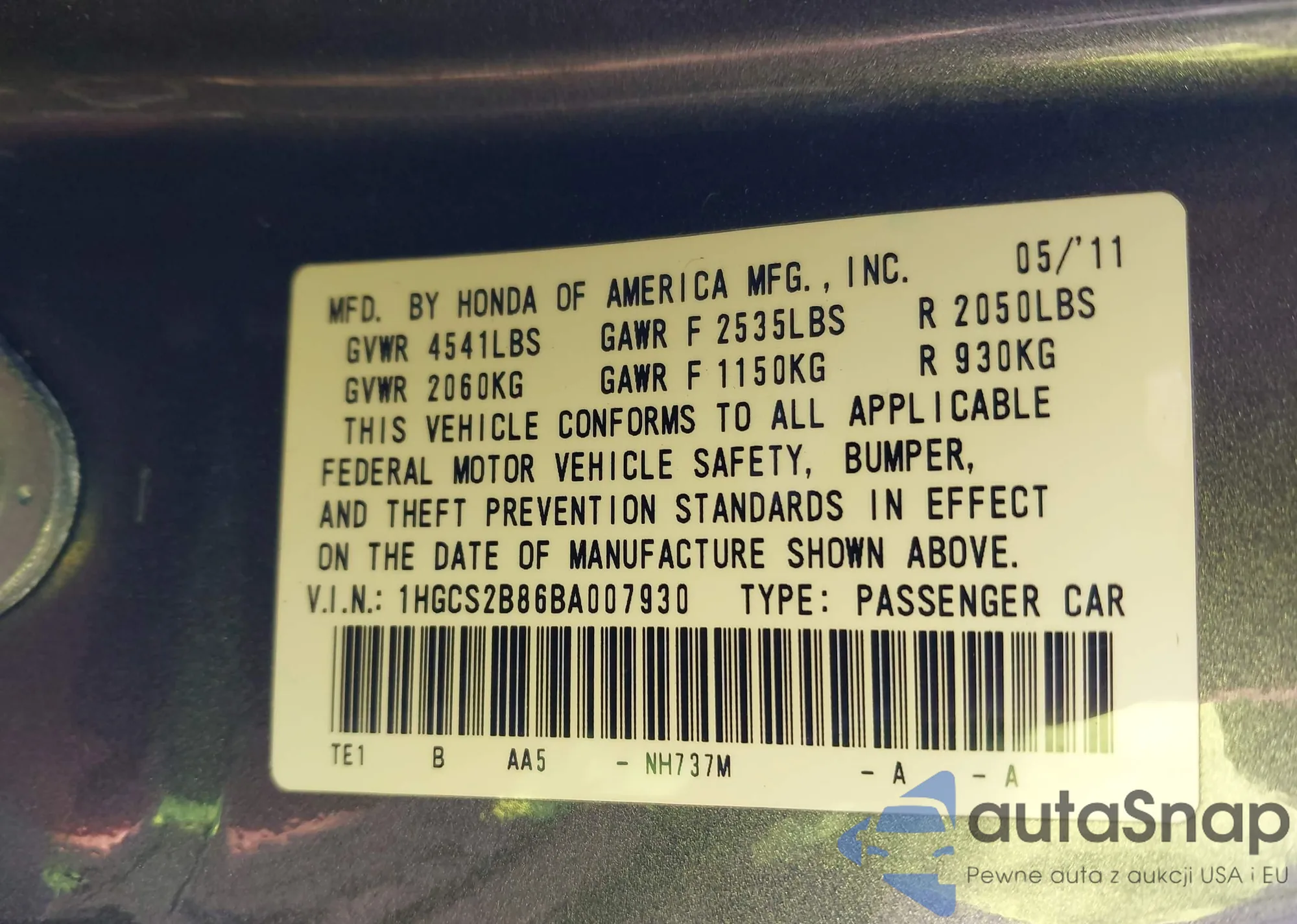 Автомобиль Honda Accord 2011 (VIN 1HGCS2B86BA007930) ранее не участвовал в торгах. Документы чистые, пробег соответствует или ниже среднего по рынку. Продаётся страховой компанией — рекомендуем покупку. Доставка в порт займет около 6–8 недель.