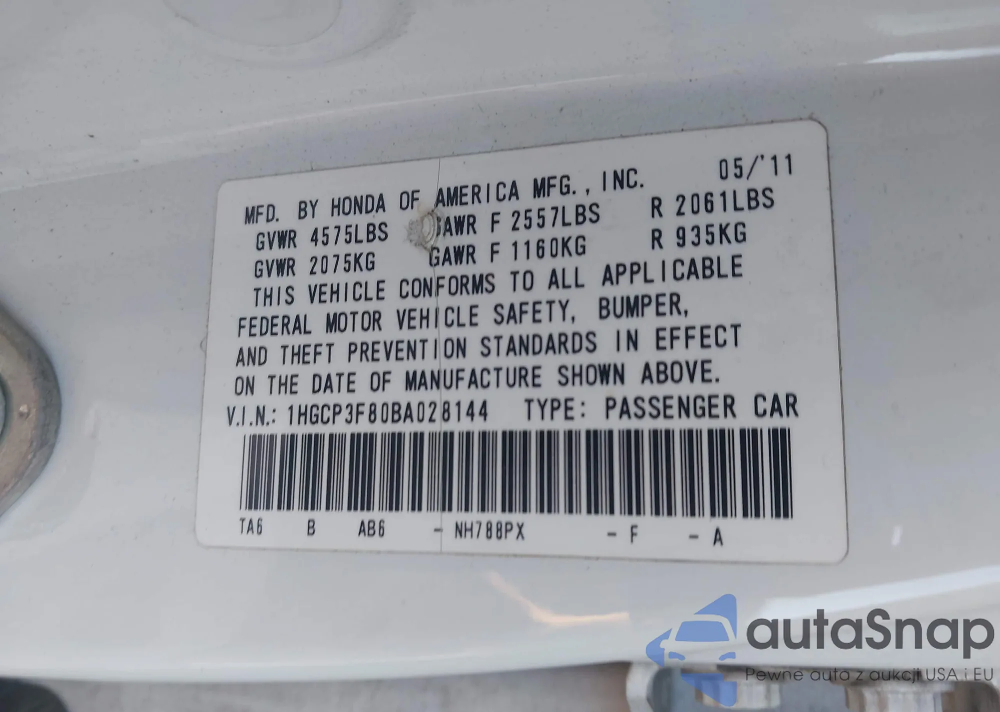 VIN: 1HGCP3F80BA028144