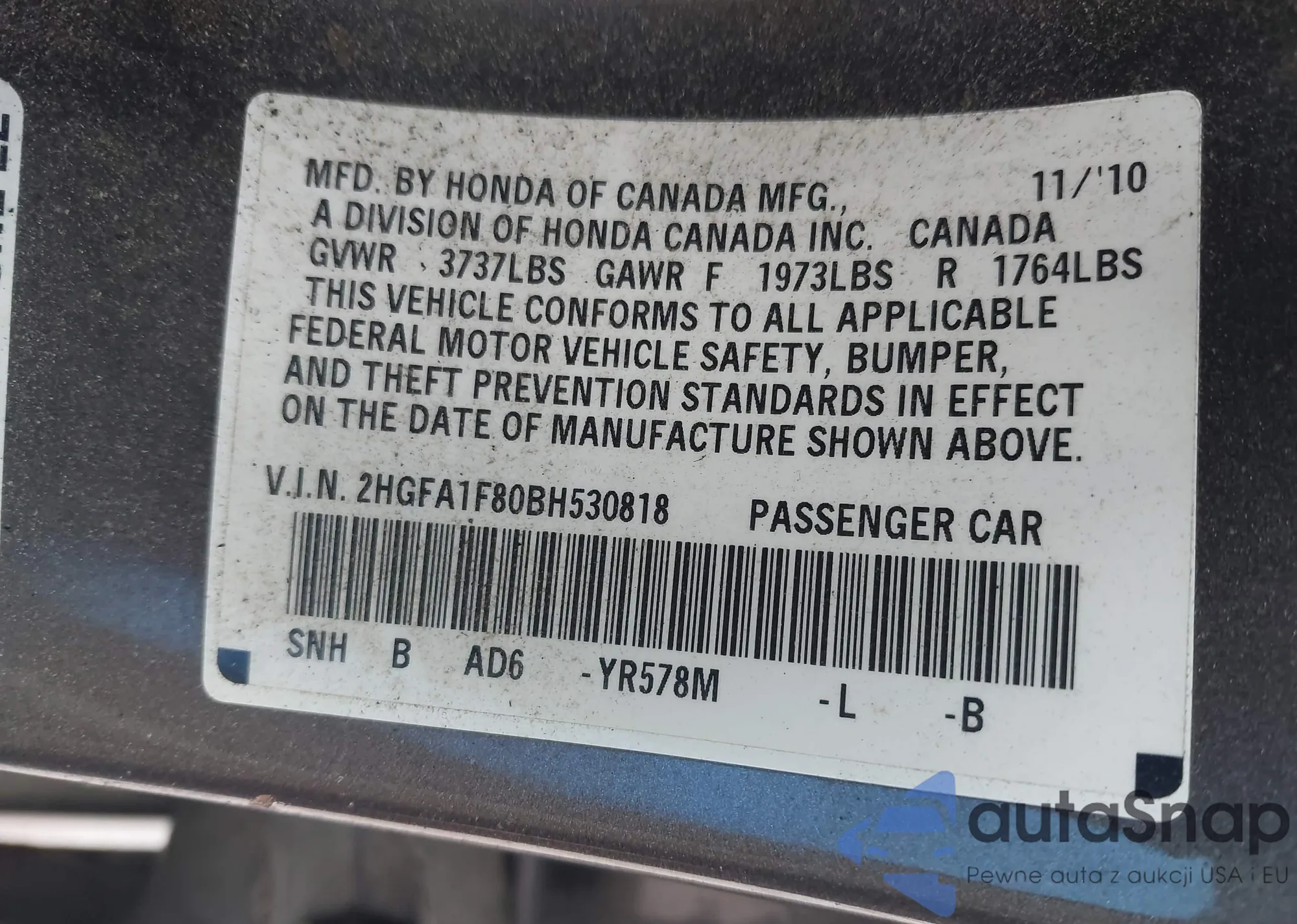 VIN: 2HGFA1F80BH530818