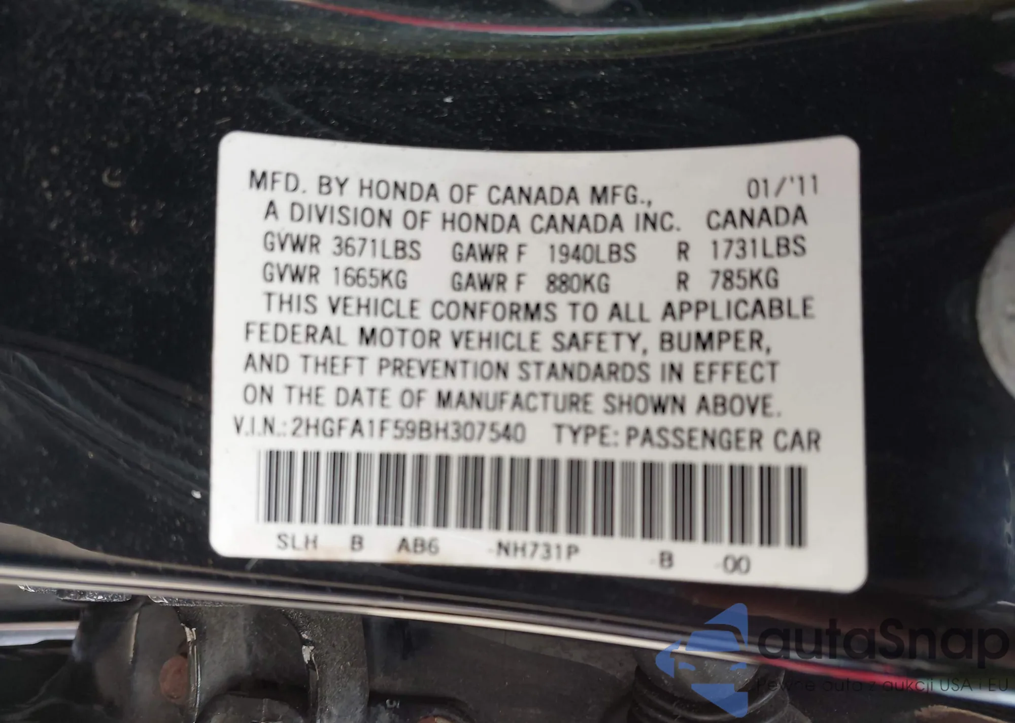 VIN: 2HGFA1F59BH307540