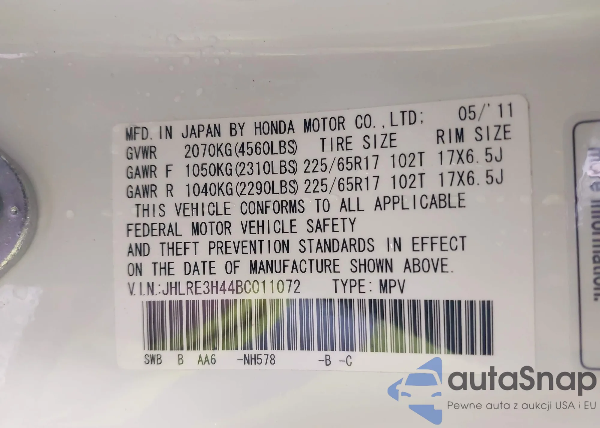 VIN: JHLRE3H44BC011072