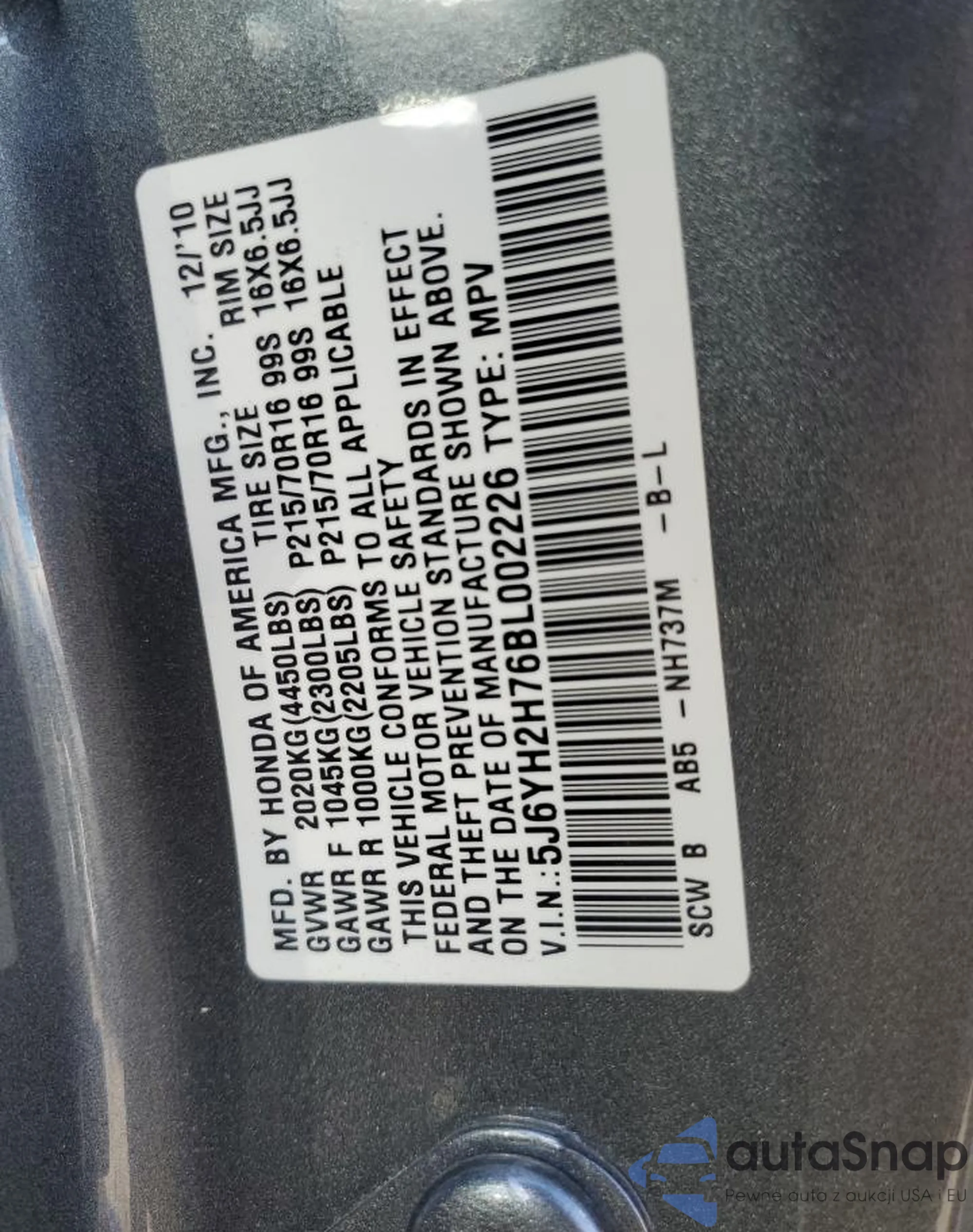 VIN: 5J6YH2H76BL002226